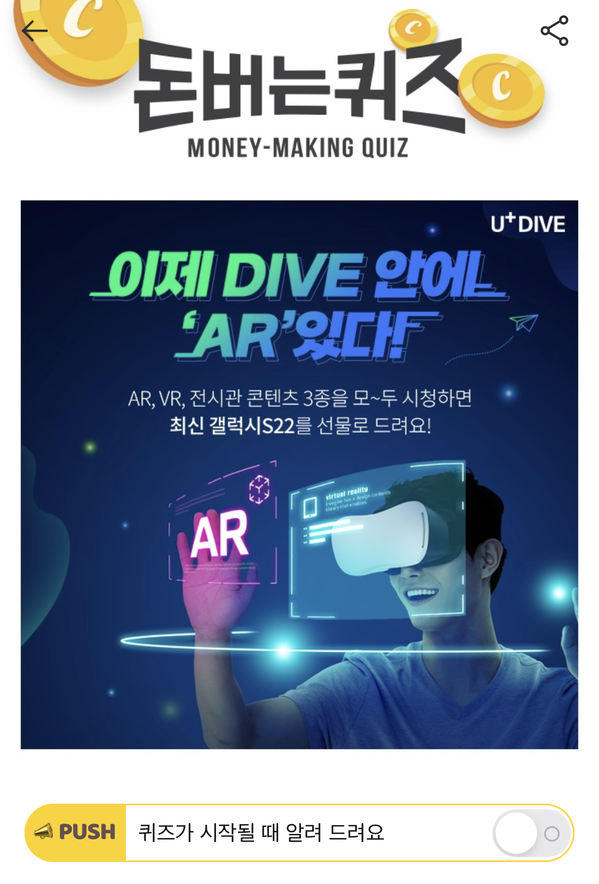 U+DIVE 앱에서 갤럭시S22를 받을 수 있는 시청 이벤트를 참여하기 위해서는