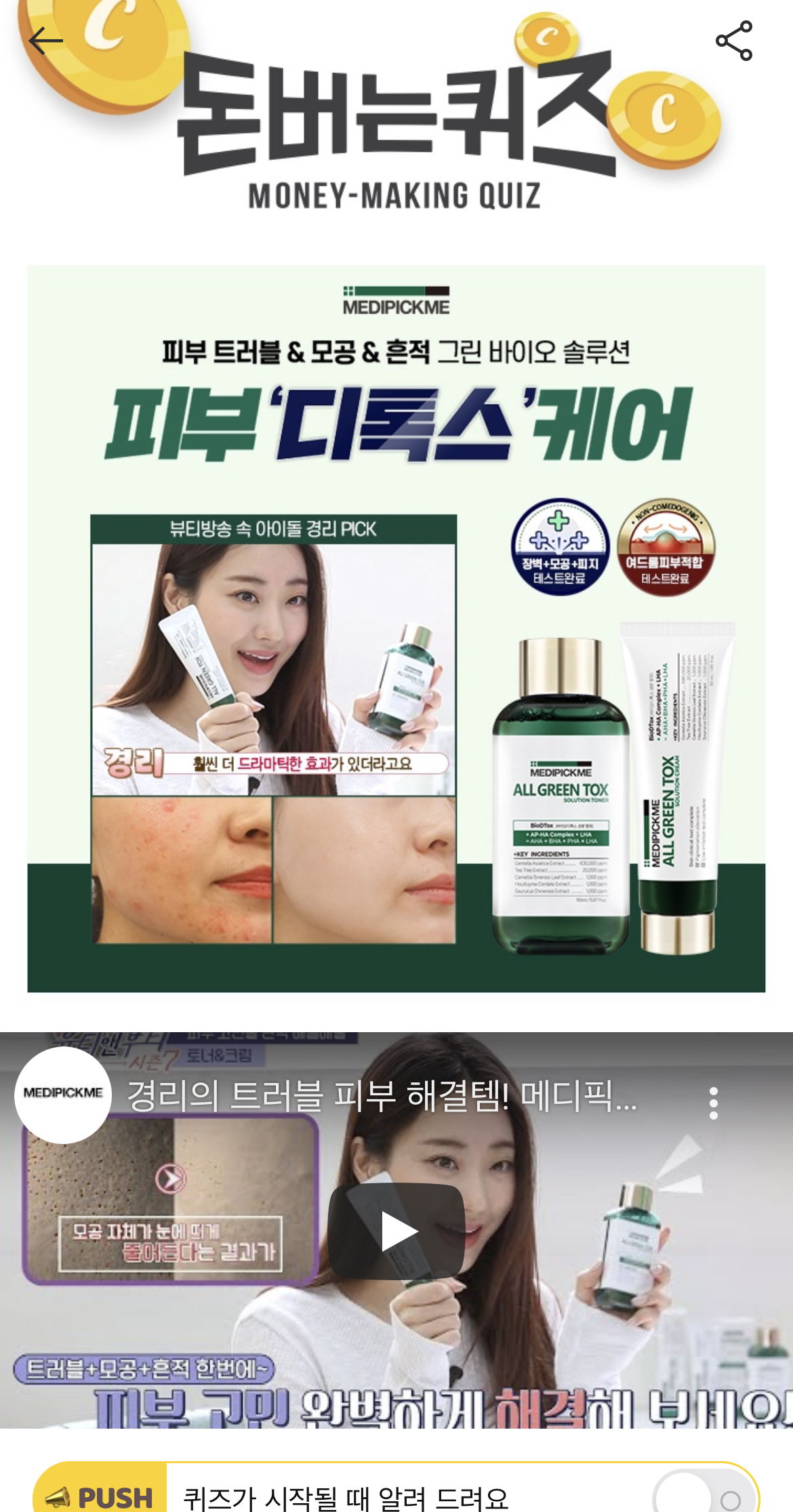 캐시워크 돈버는 퀴즈 정답 메디픽미 올그린톡스 솔루션 토너와 크림 ㅂㅇㅇㄷㅌㅅ