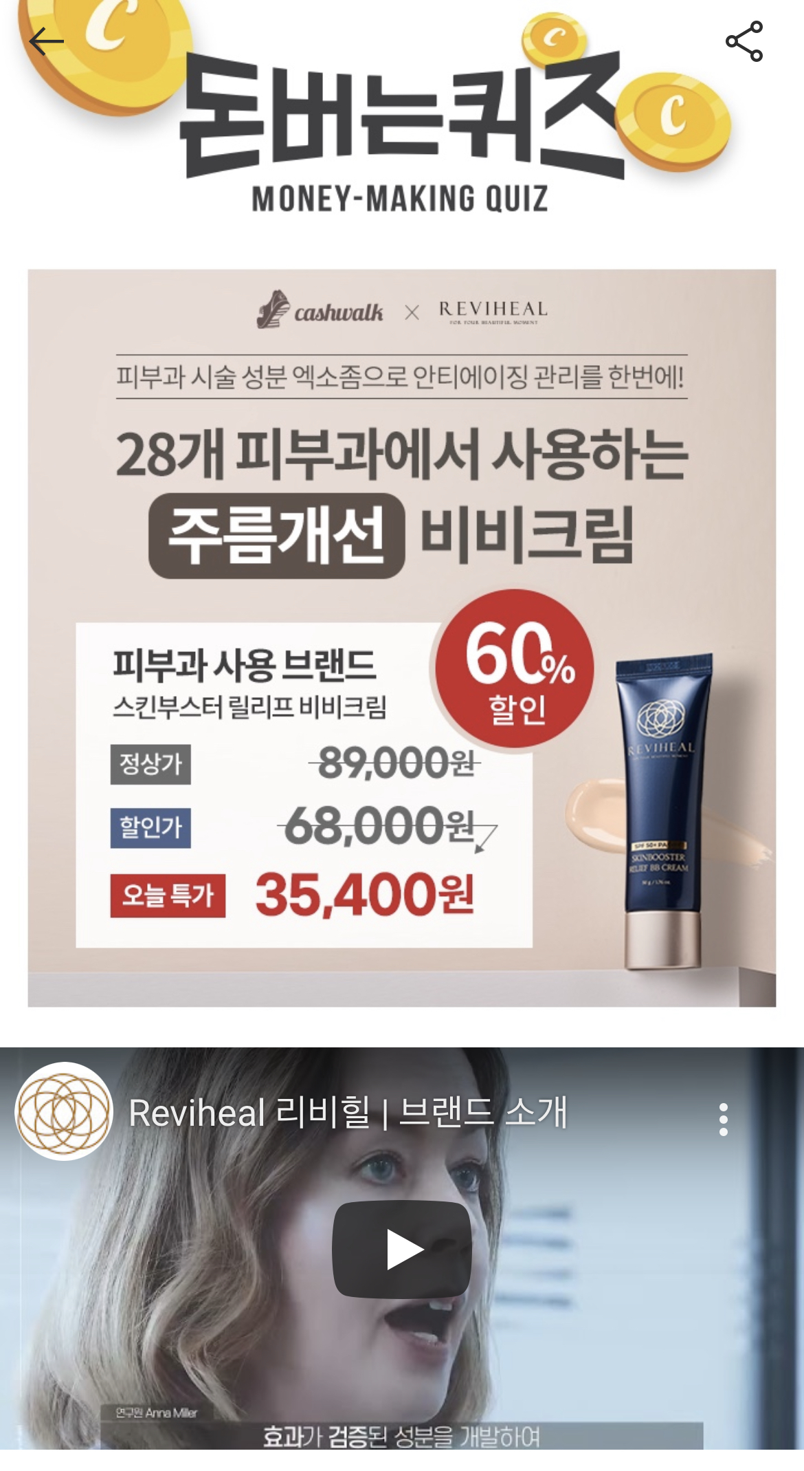 캐시워크 돈버는 퀴즈 정답 리비힐 스킨부스터 릴리프 BB크림 ㅈㅇㅅㅊㄷ