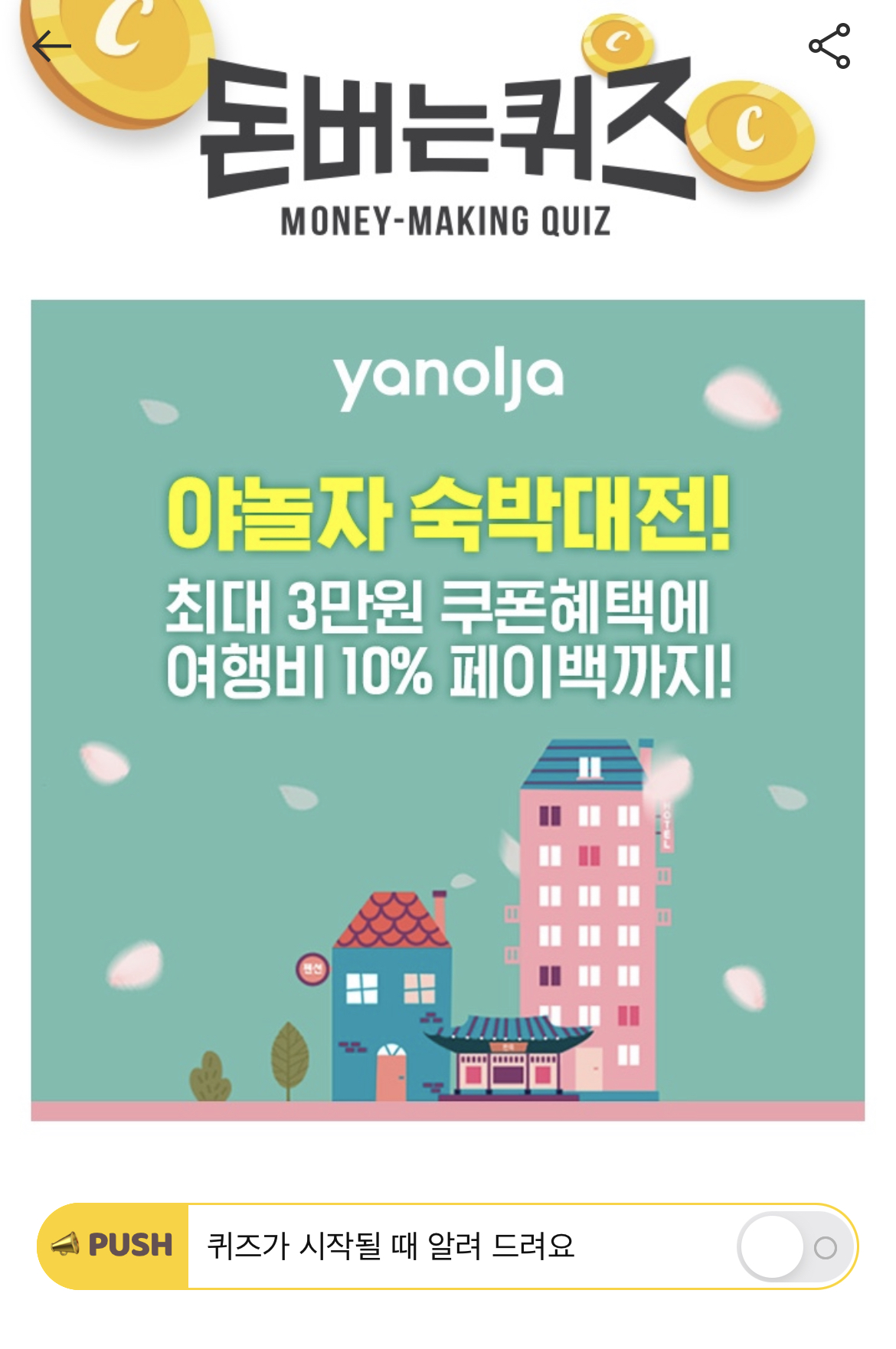 캐시워크 돈버는 퀴즈 정답 야놀자 대한민국 숙박대전