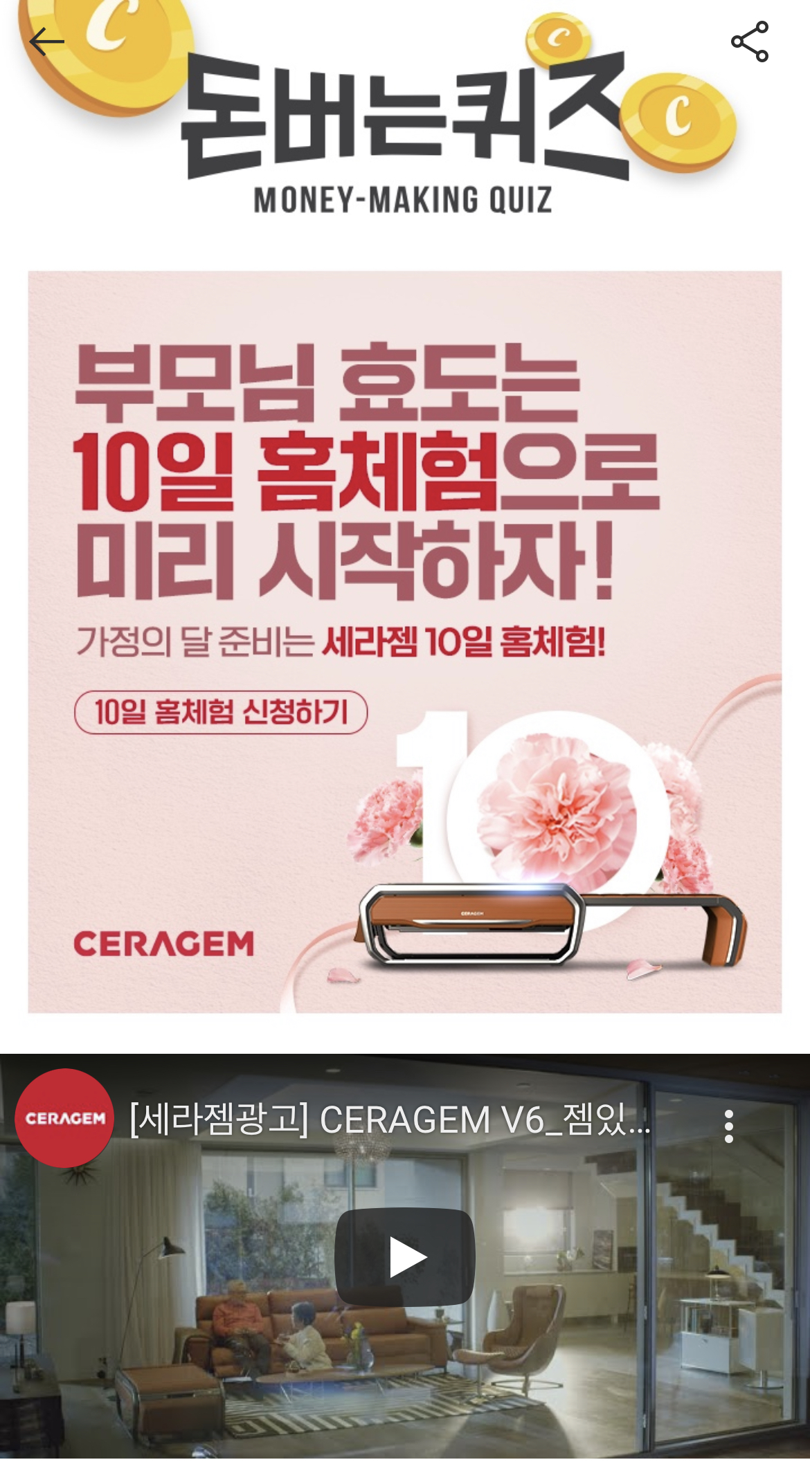 캐시워크 돈버는 퀴즈 정답 세라젬 V6 체험