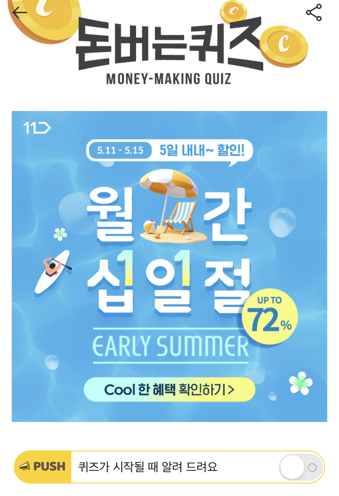 캐시워크 돈버는퀴즈 정답 월간십일절 OO 쇼핑지원금