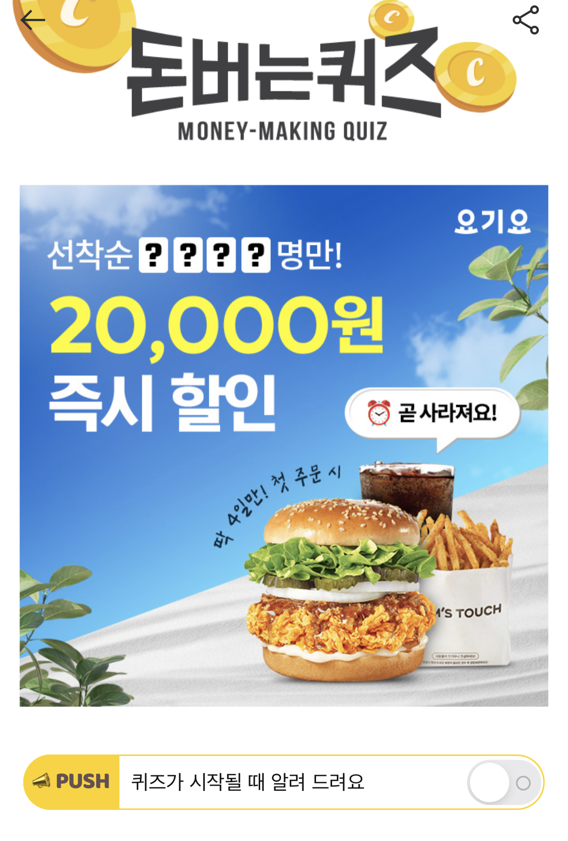 캐시워크 돈버는퀴즈 정답 요기요 맘스터치 싸이버거 세트 2개 공짜