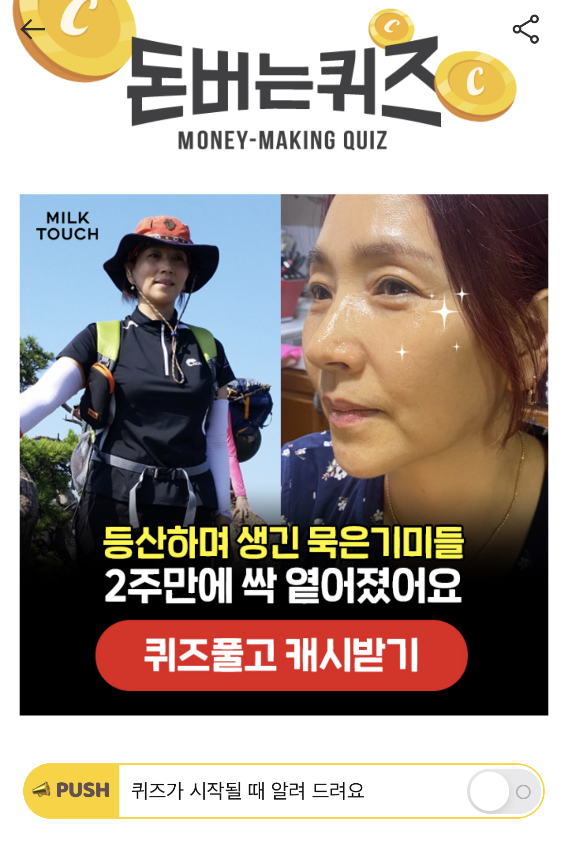 캐시워크 돈버는퀴즈 정답 밀크터치 기미잡티토닝세럼 과일