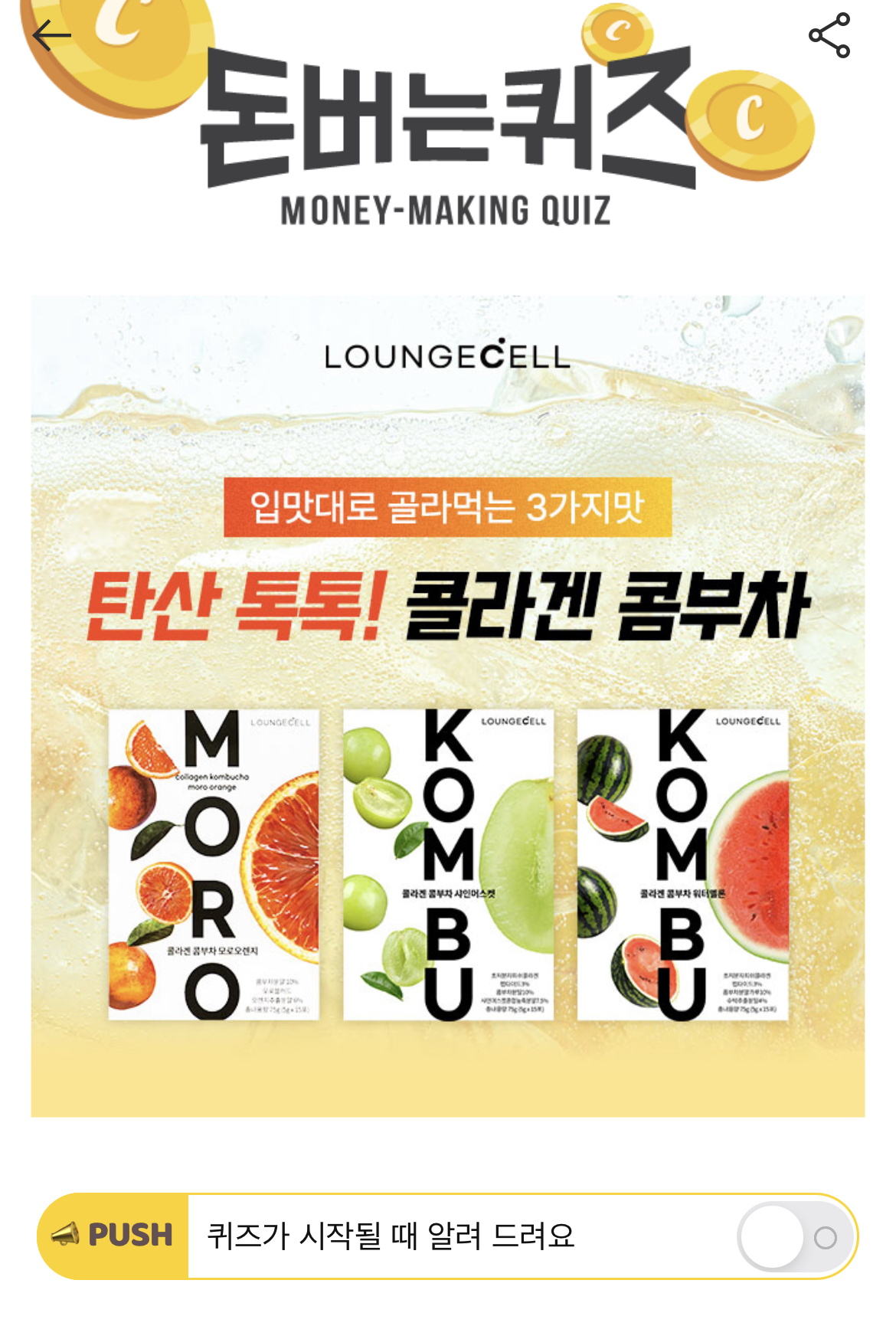 캐시워크 돈버는퀴즈 정답 라운지셀 콜라겐 콤부차 ㅋㅂㅊ/ㅁㄹㅇㄹㅈ