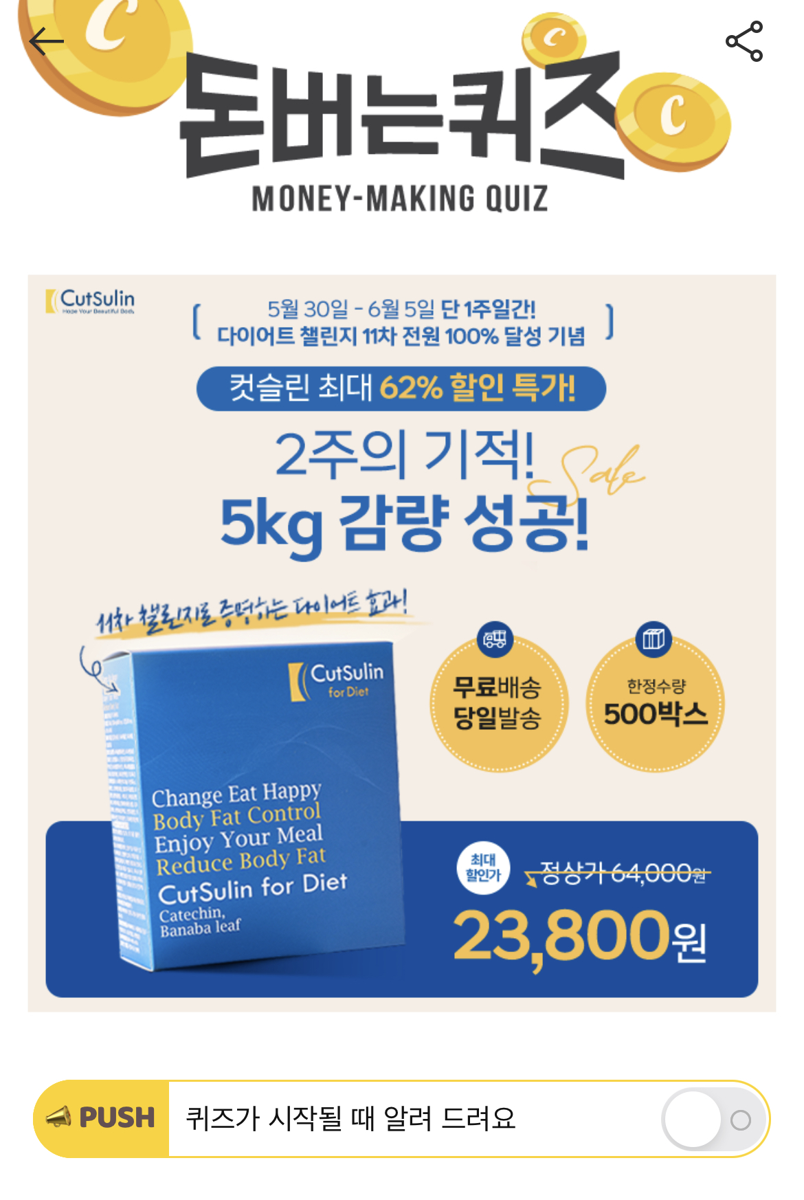 [한정수량 500박스] 컷슬린 포 다이어트 62% 할인 이벤트 OPEN! "2주의 기적, 5kg 감량 성공!" 챌린지 찐후기 증명!