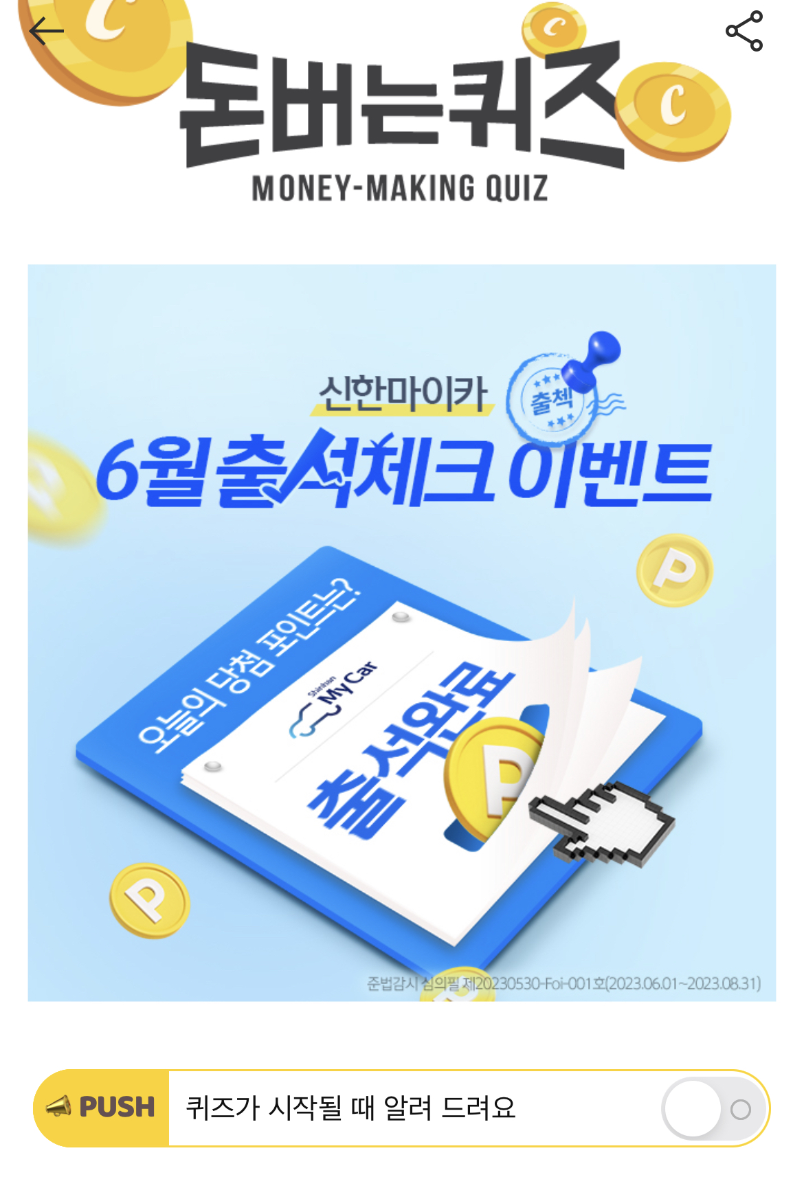 캐시워크 돈버는퀴즈 정답 신한마이카 신규등록 이벤트 구경