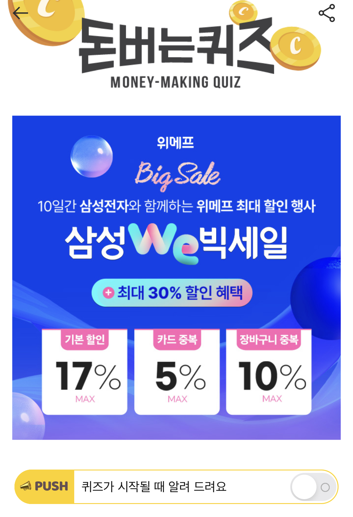 캐시워크 돈버는퀴즈 정답 위메프 삼성WE빅세일 영어