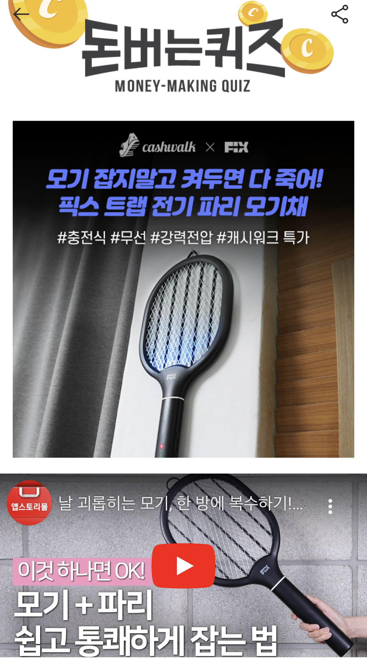 캐세워크 돈버는퀴즈 정답 픽스 트랩 전기 파리 모기채 ㅌㄹ
