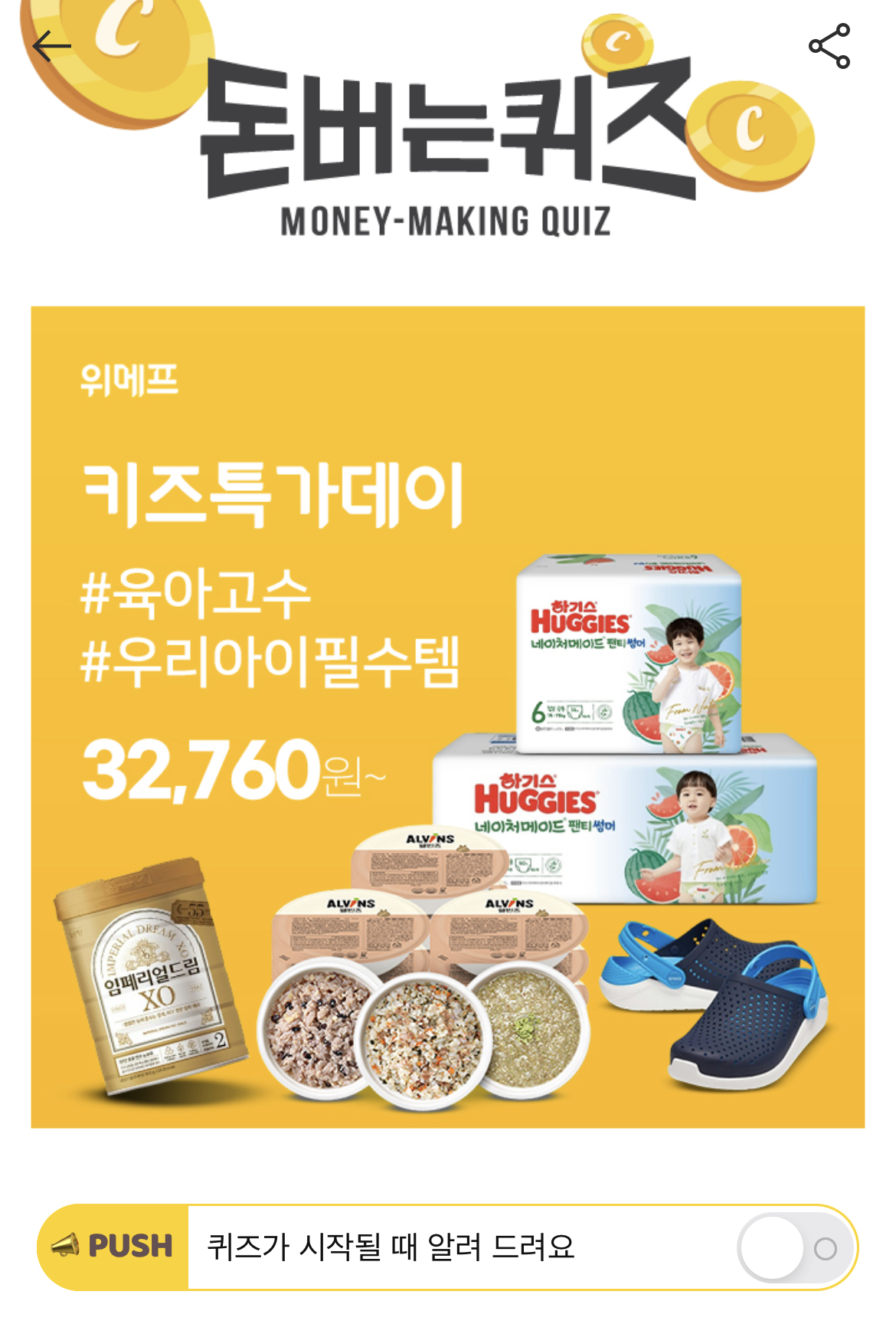 캐시워크 돈버는퀴즈 정답 위메프 키즈특가데이