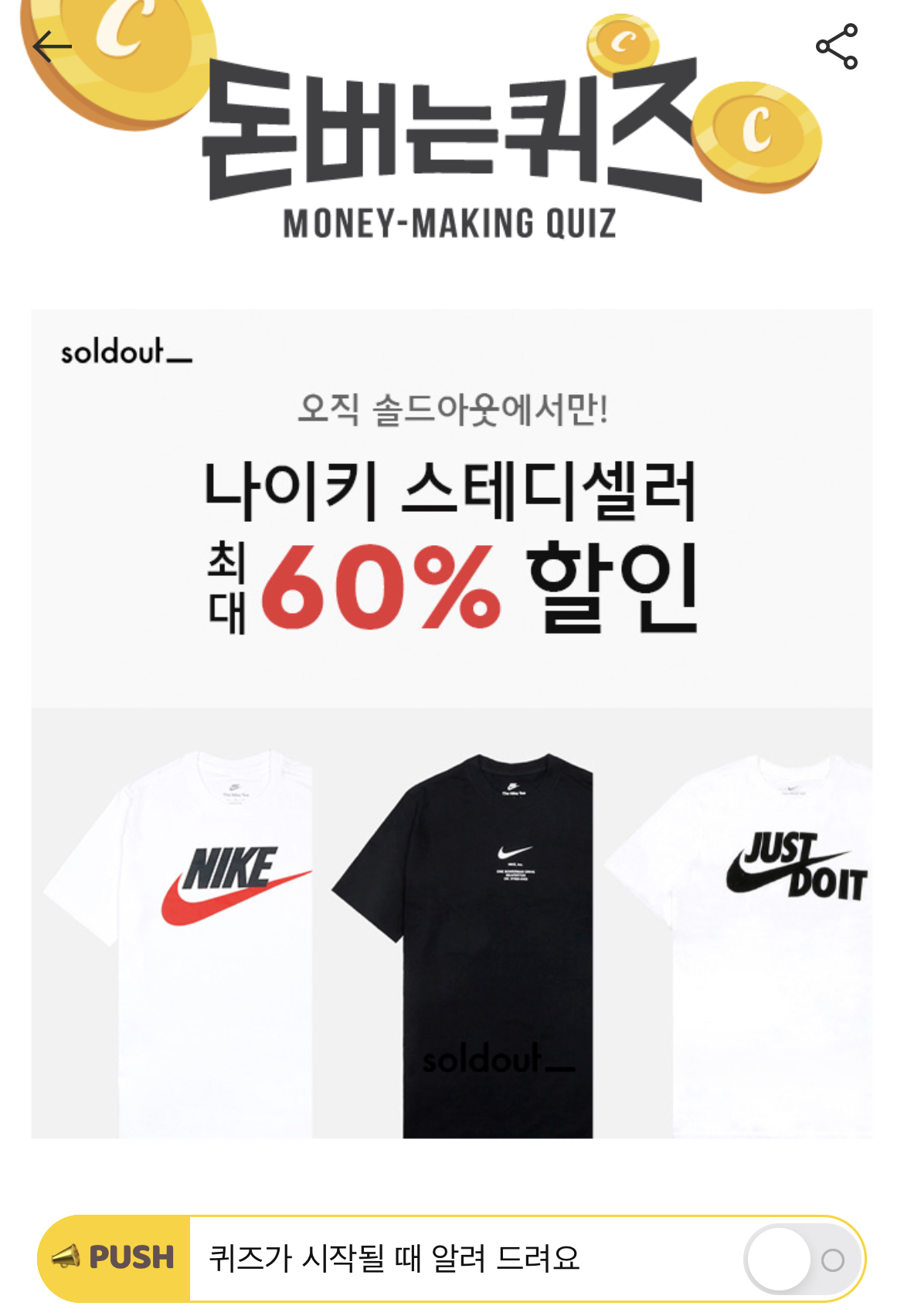 캐시워크 돈버는퀴즈 정답 솔드아웃 나이키 NSW 아이콘 ㅇㅇㅇ 반팔티 화이티 레드