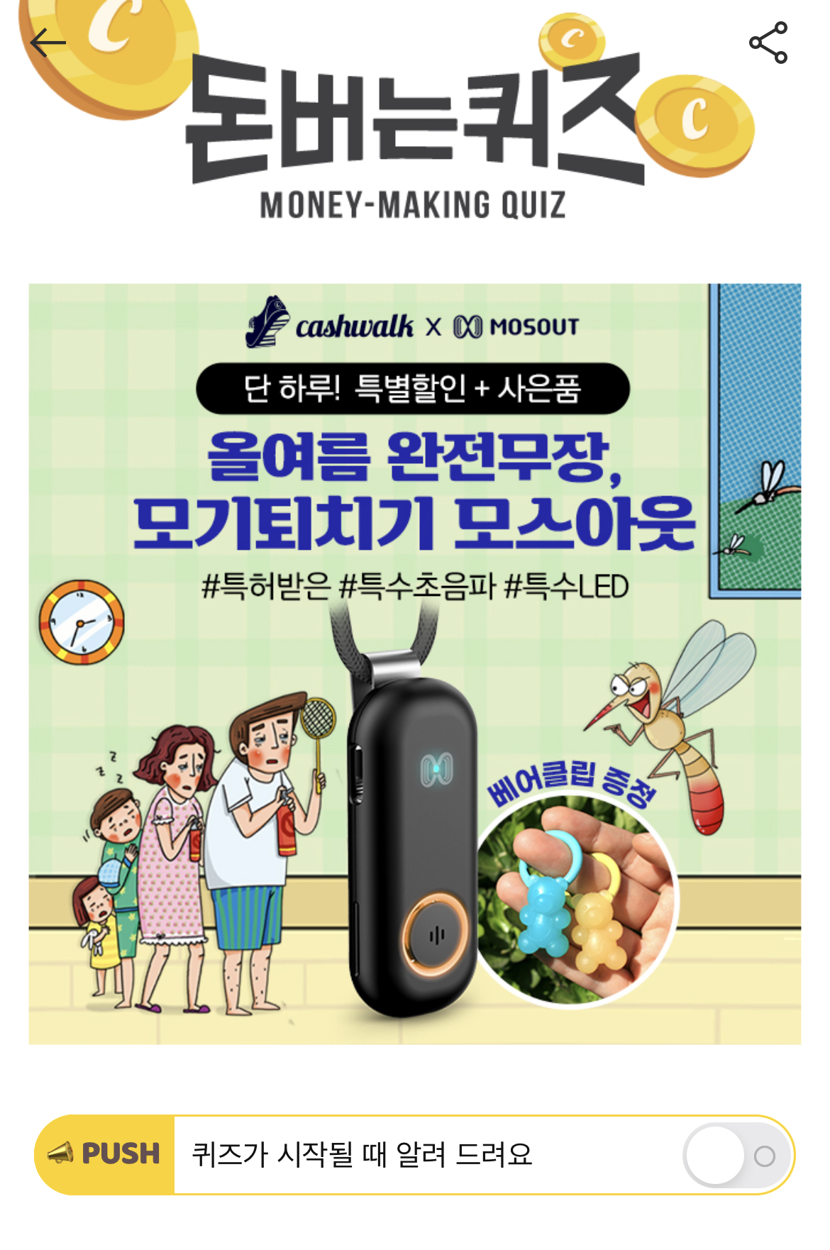 캐시워크 돈버는퀴즈 정답 모스아웃 모기 해충퇴치기 숫자