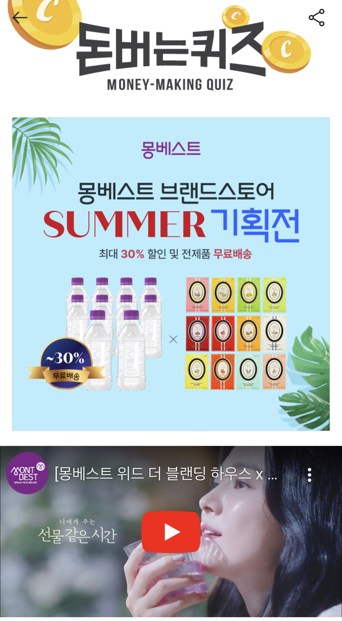 캐시워크 돈버는퀴즈 정답 몽베스트 생수 X 몽베스트 블랜딩 하우스 ㅁㅂㅅㅌㅋㅂㅊ