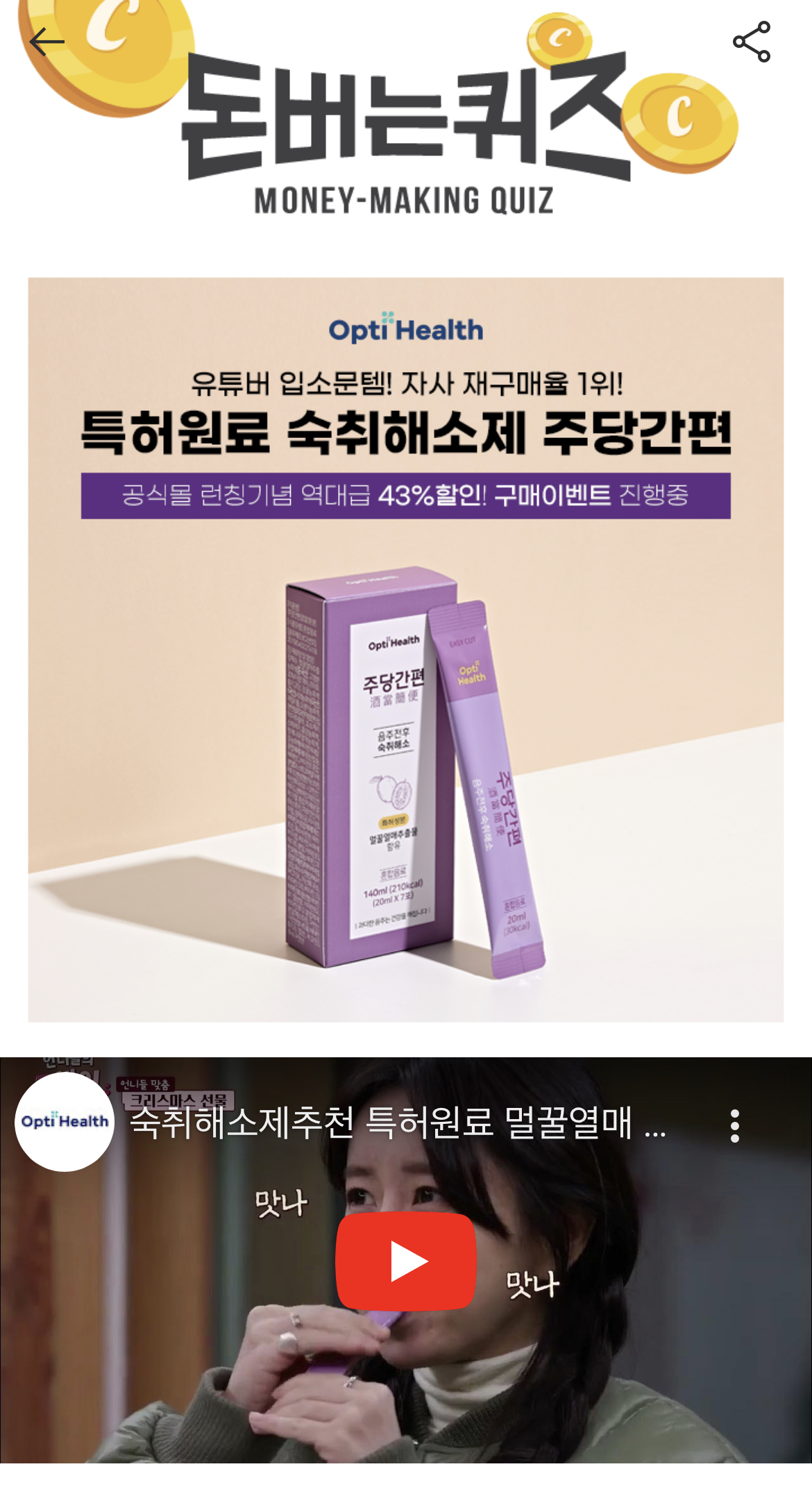 캐시워크 돈버는퀴즈 정답 옵티헬스 특허원료 주당간편 ㅇㅅ