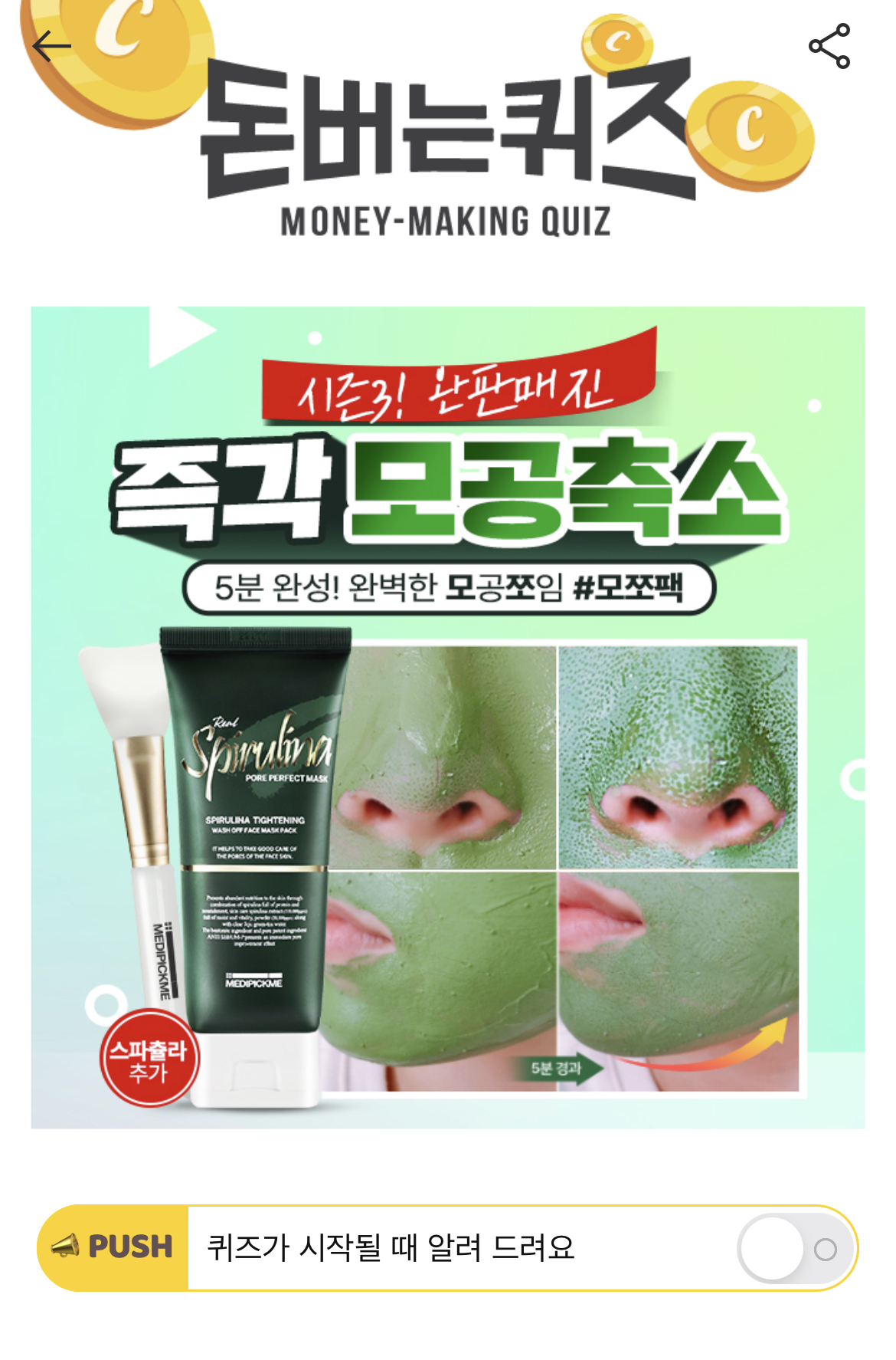 캐시워크 돈버는퀴즈 정답 메디픽미 스피룰리나 마스크팩 성분/ㅁㅉㅍ/ㄴㅊㅅ