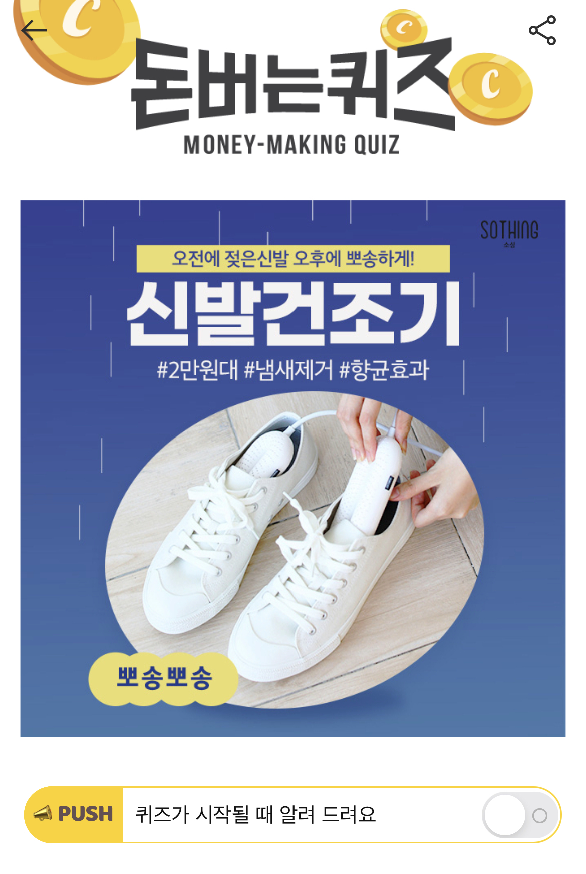 캐시워크 돈버는퀴즈 정답 소싱 제로 신발 건조기