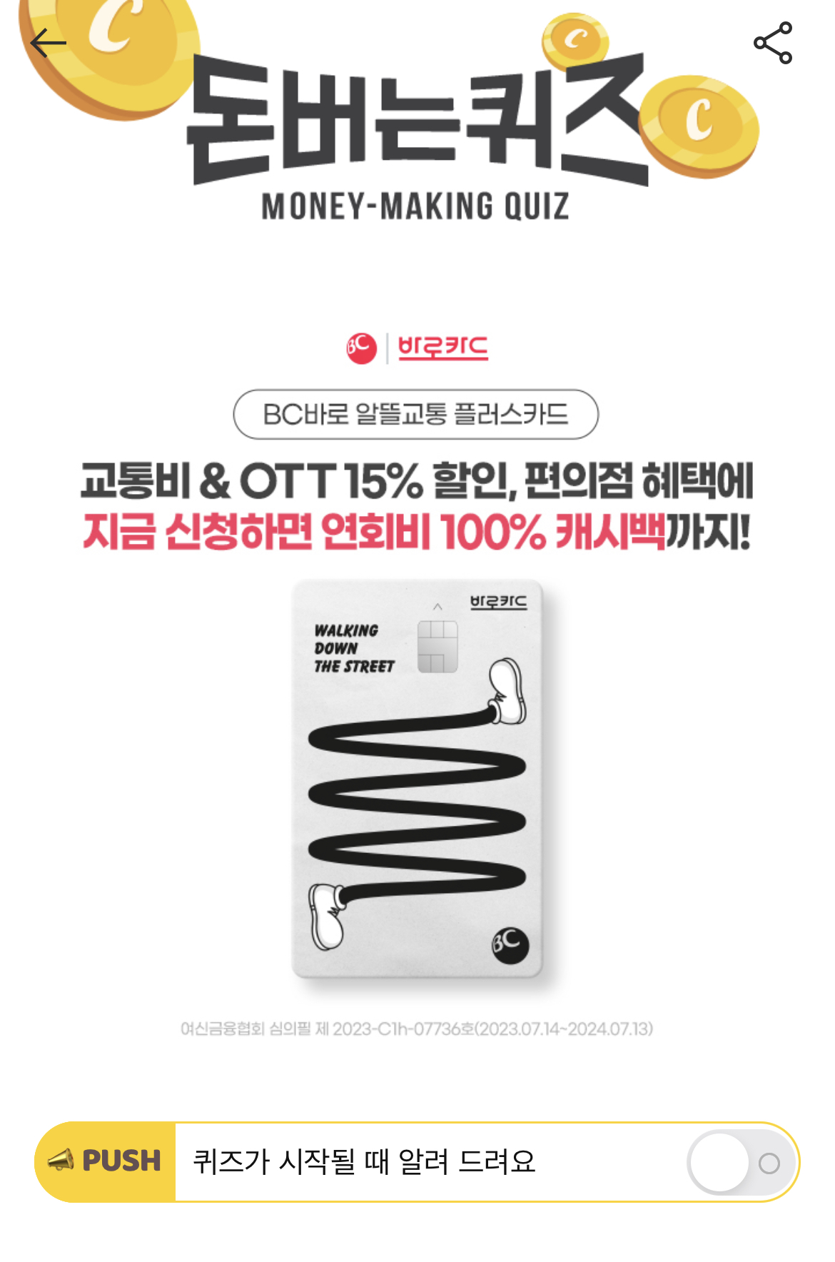 캐시워크 돈버는퀴즈 정답 BC 바로 알뜰교통플러스 카드