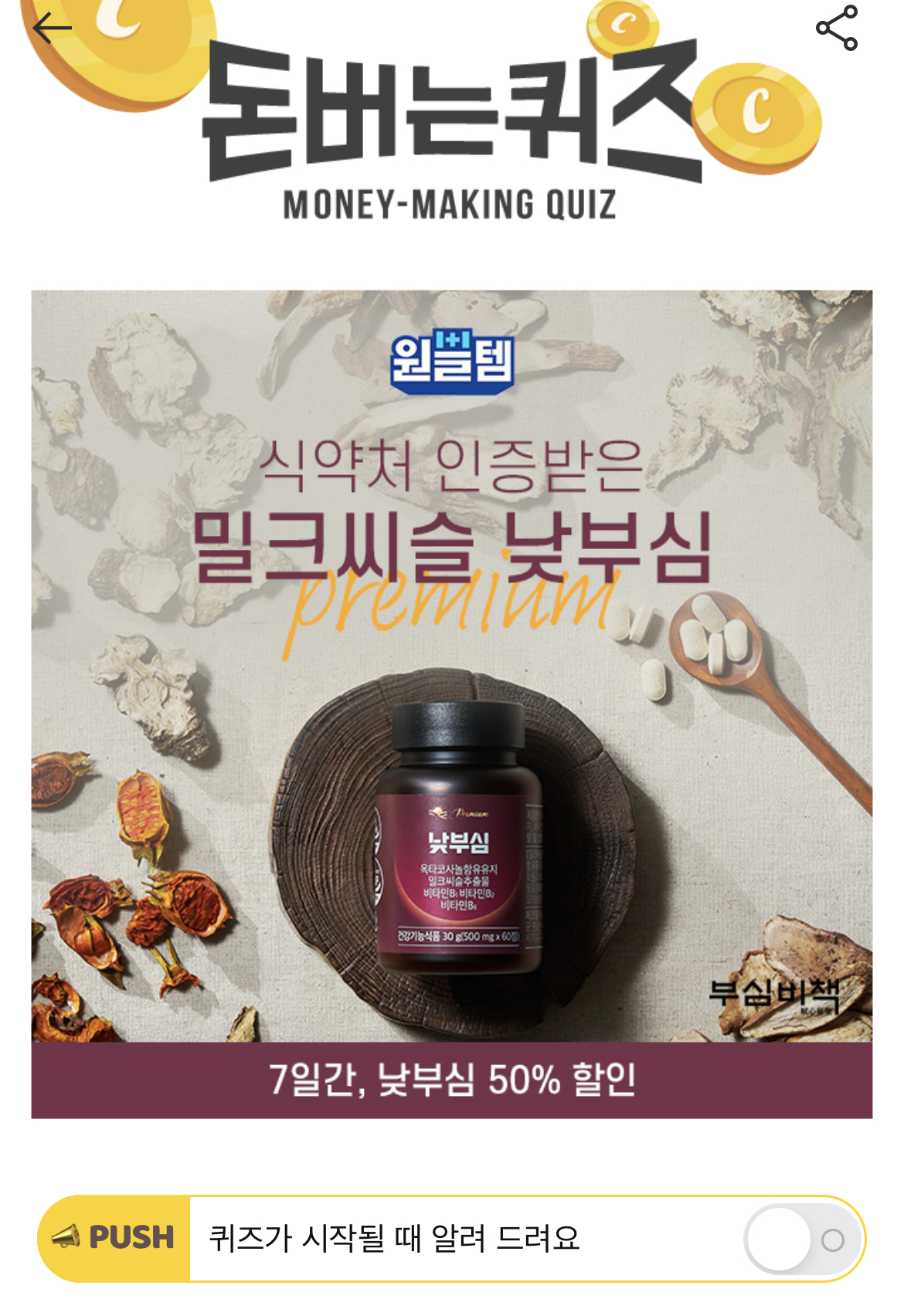 캐시워크 돈버는퀴즈 정답 부심비책 밀크씨슬 낮부심