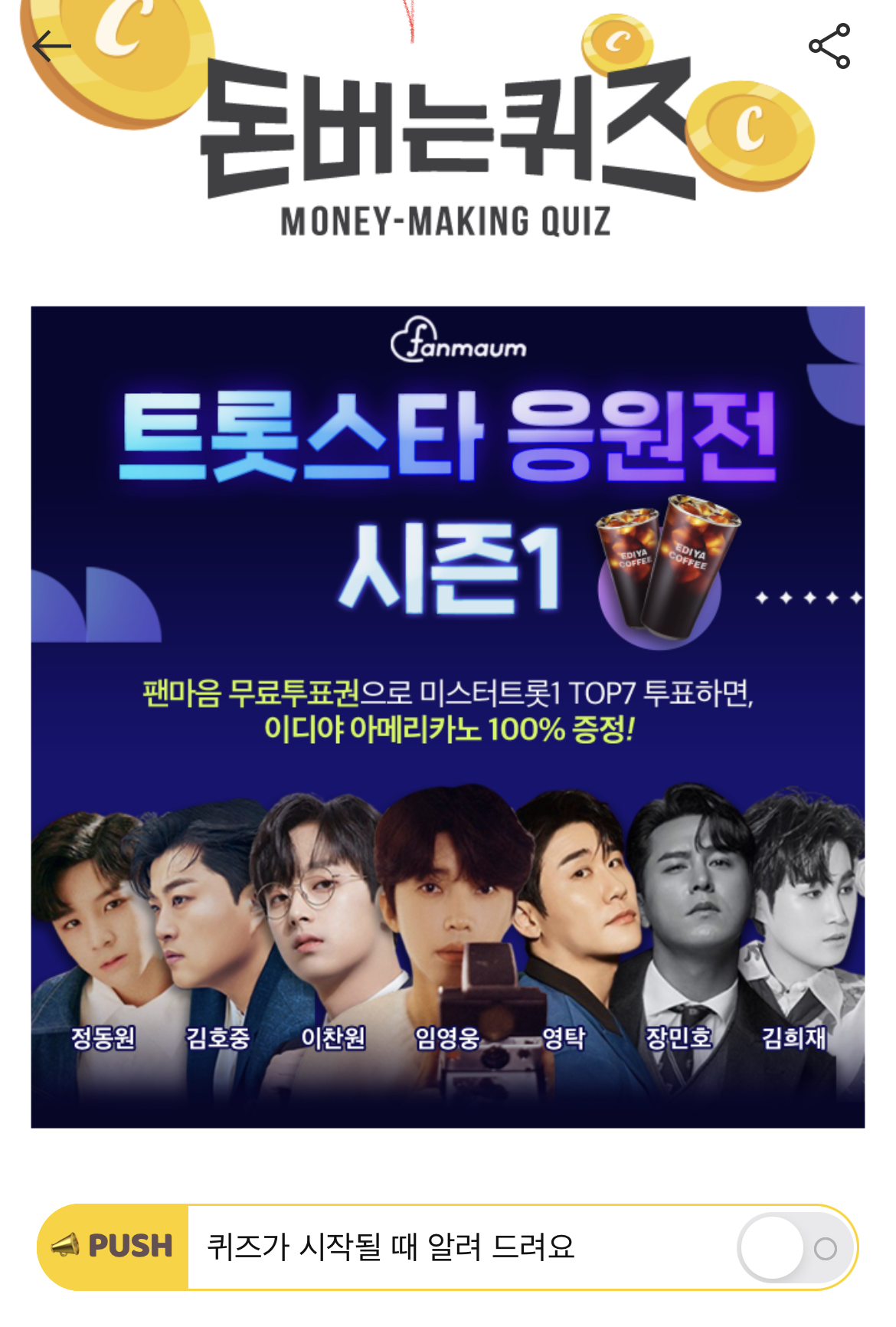 캐시워크 돈버는퀴즈 정답 팬마음 트롯스타 응원전
