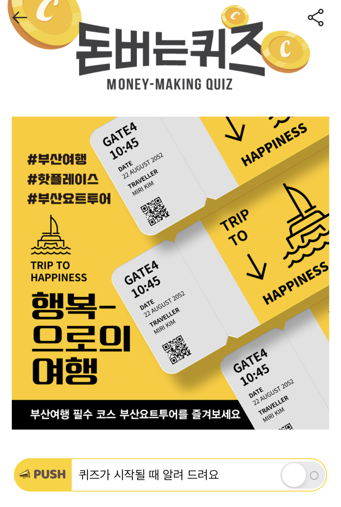 캐시워크 돈버는퀴즈 정답 부산여행 해운대놀거리 상품 부산요트투어