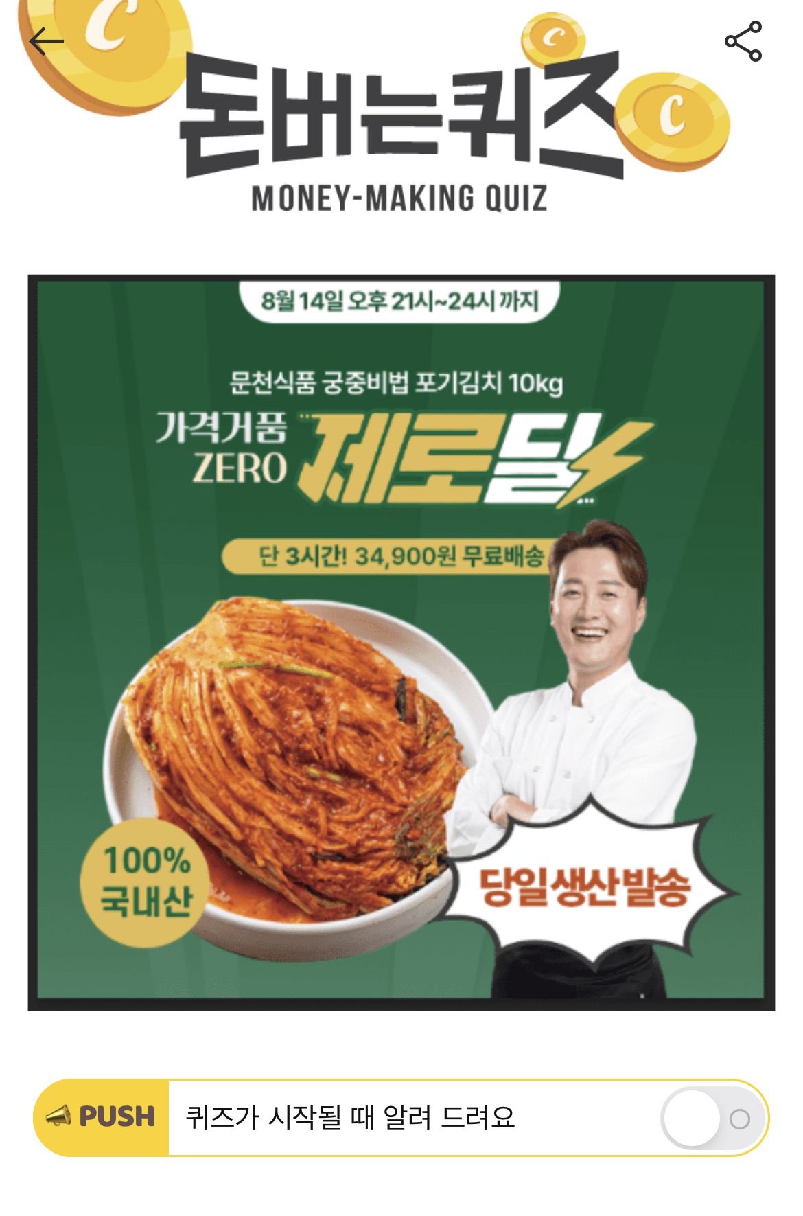 3시간 동안 진행되는 "제로딜" 타임특가에서 문천식품 임금님의 수라상에 올리던 궁중비법 포기김치 10kg가 역대급 OO% 할인으로 진행됩니다. 빈 칸에 들어갈 숫자는 무엇일까요?