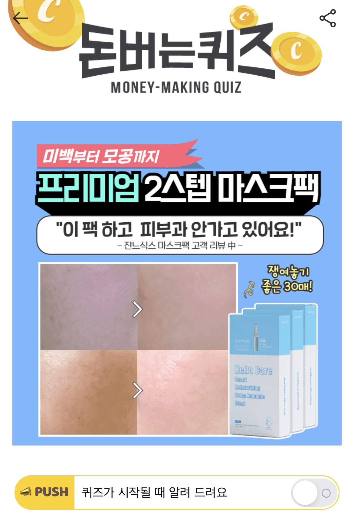 캐시워크 돈버는퀴즈 정답 쟌느식스 마스크팩 ㅎㅇㄹㄹㅅ/ㅊㅇㅅㅁ