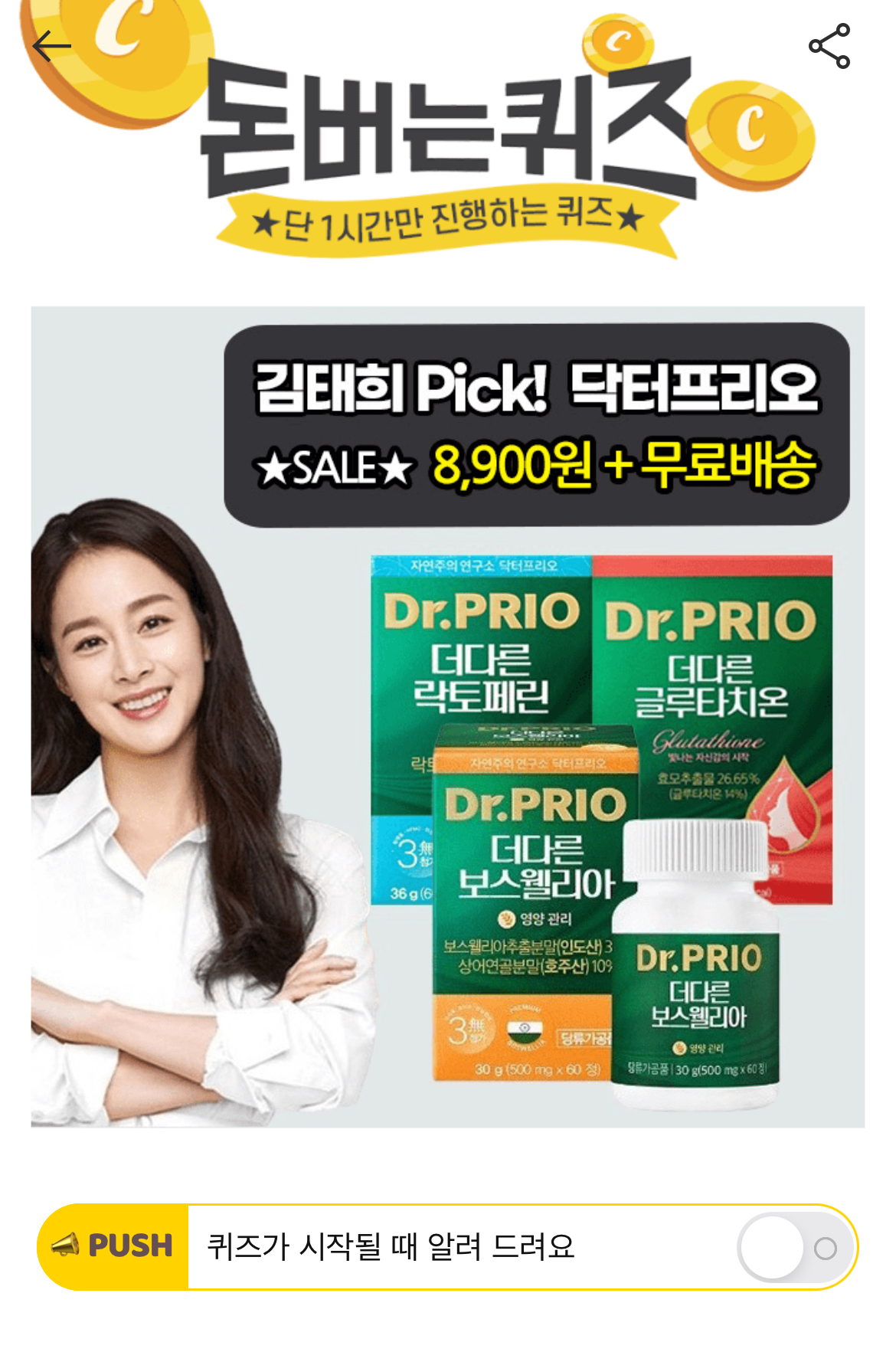 닥터프리오 건강식품 김태희 Pick 문제 닥터프리오 더다른 락토페린 1개월분의 주성분인 "락토페린"의 프리미엄 원산지는 OOOO산 입니다. 빈 칸에 들어갈 글자는 무엇일까요?