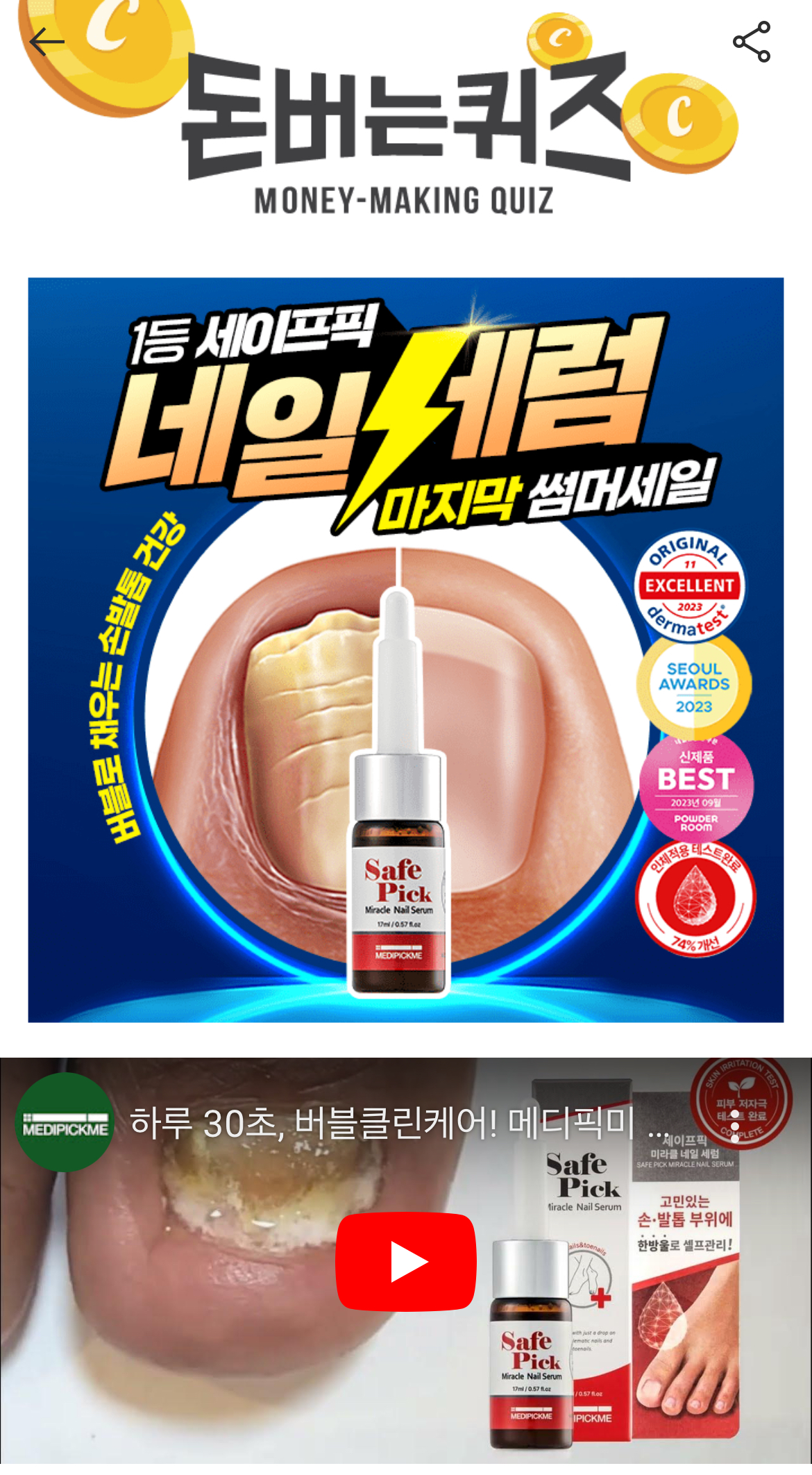 캐시워크 돈버는퀴즈 정답 메디픽미 세이프픽 미라클 네일세럼