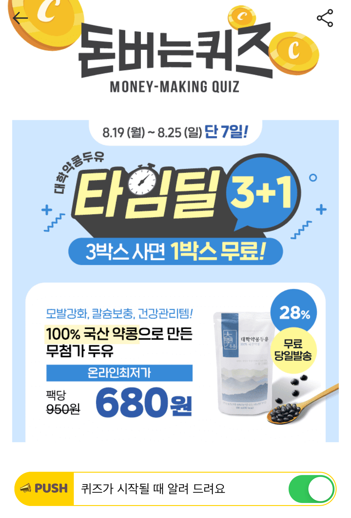 [1박스 무료] 단 7일 대학약콩두유 타임딜 OPEN! 지금 구매 시, 1박스 무료증정 & 온라인최저가 기회! 대학약콩두유의 약콩은 OOOO이라고도 불리며 풍부한 영양과 고소한 맛이 일품인데요. 대두를 사용하지 않고 100% 국내산 약콩만을 껍질째 갈아 만들어 일반 두유보다 진한 맛과 높은 함량의 영양을 자랑합니다! OOOO는 무엇일까요?