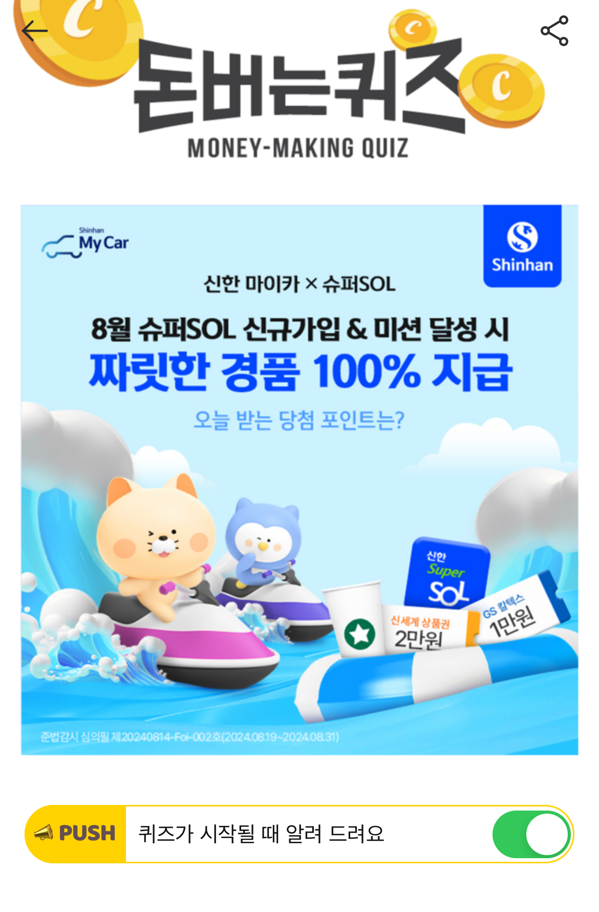 캐시워크 돈버는퀴즈 정답 신한마이카 ㅅㅊㅎㄱ