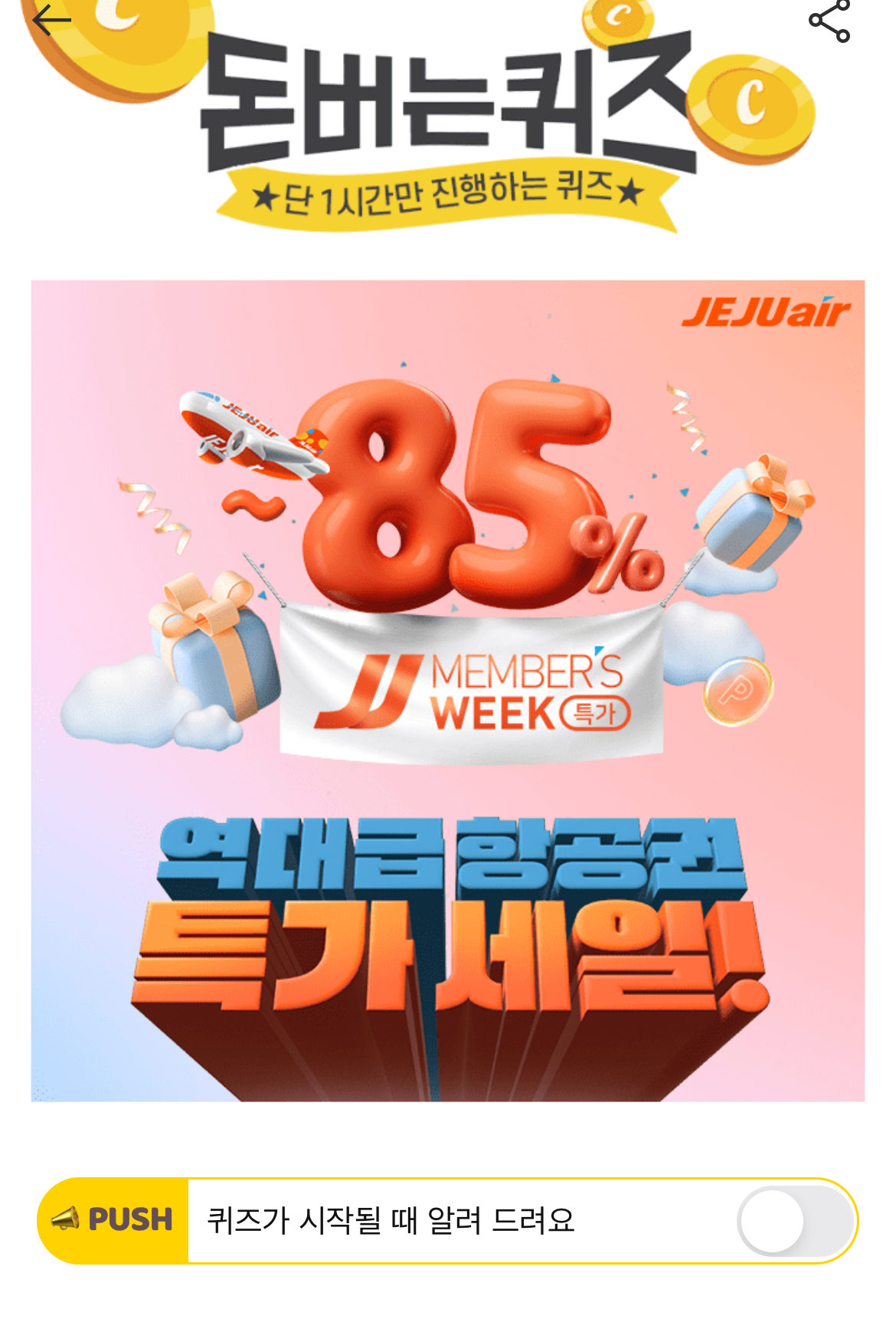 캐시워크 돈버는퀴즈 정답 제주항공 JJ멤버스위크