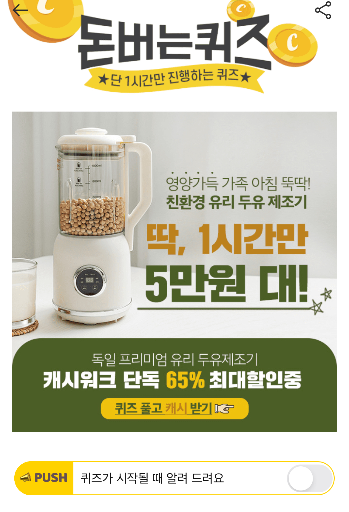 캐시워크 돈버는퀴즈 정답 독일 친환경 내열강화유리 두유 제조기