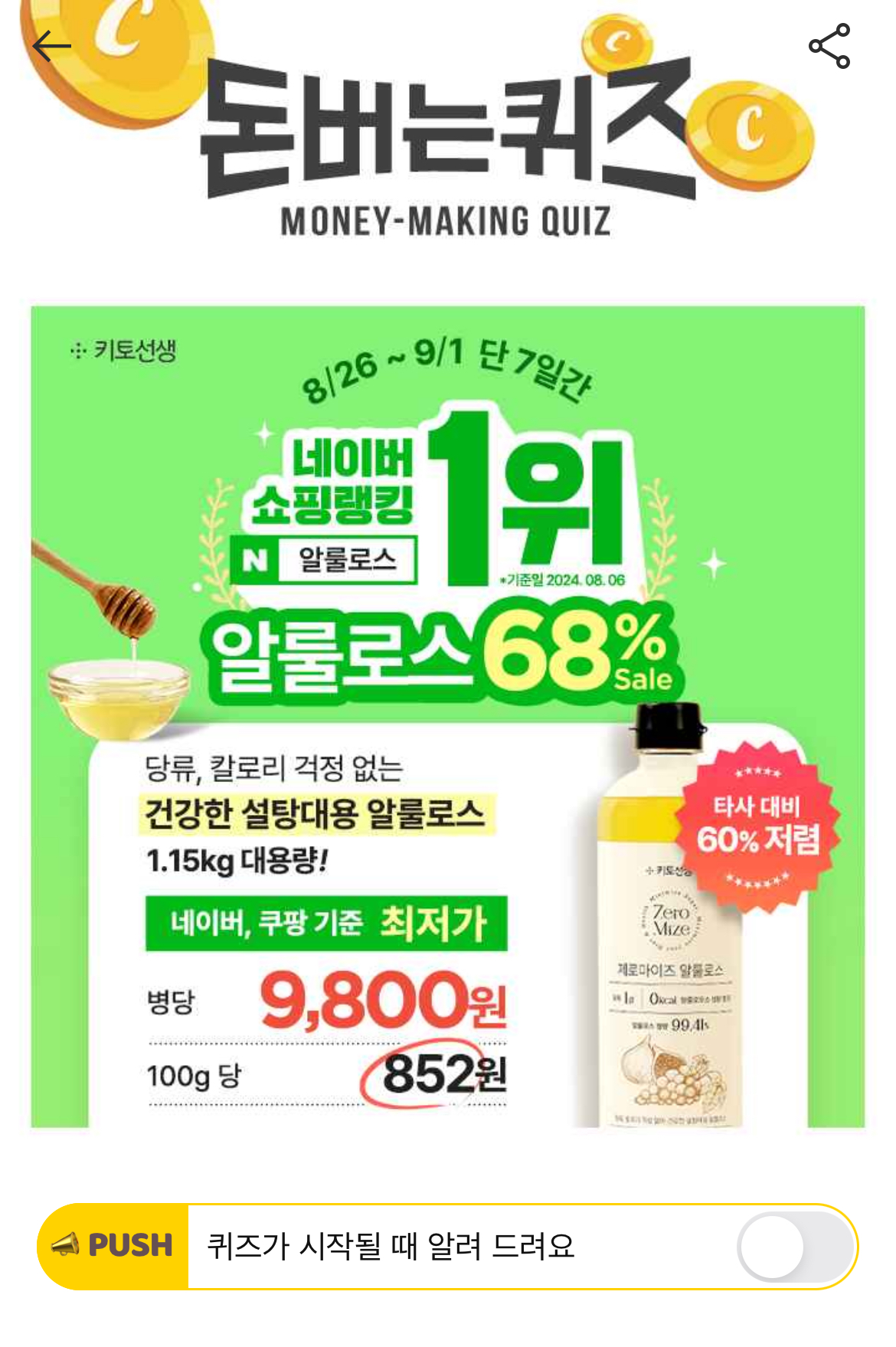 [단 7일] 네이버 쇼핑 '알룰로스' 랭킹 1위 기념! 68% 할인 이벤트 1.15kg 대용량 알룰로스 단돈 9,800원 & 네이버, 쿠팡 기준 최저가 100g당 852원! 맛과 건강 모두 챙기고 싶다면 당류, 칼로리 걱정 ZERO! 간편하게 OO OO한 액상형 알룰로스 제로마이즈 알룰로스를 선택하세요! OOOO은 무엇일까요?