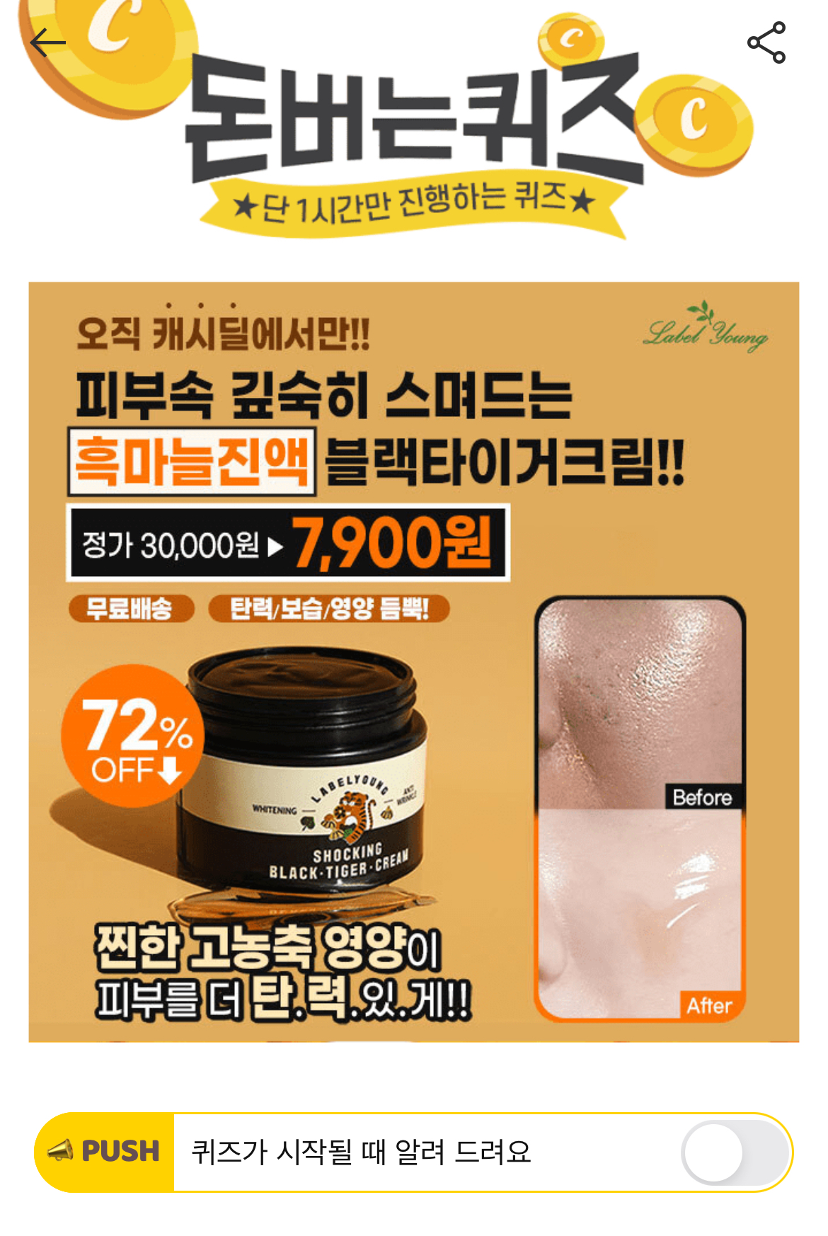 캐시워크 돈버는퀴즈 정답 캐시딜 타임특가 라벨영 고농축 000영양크림