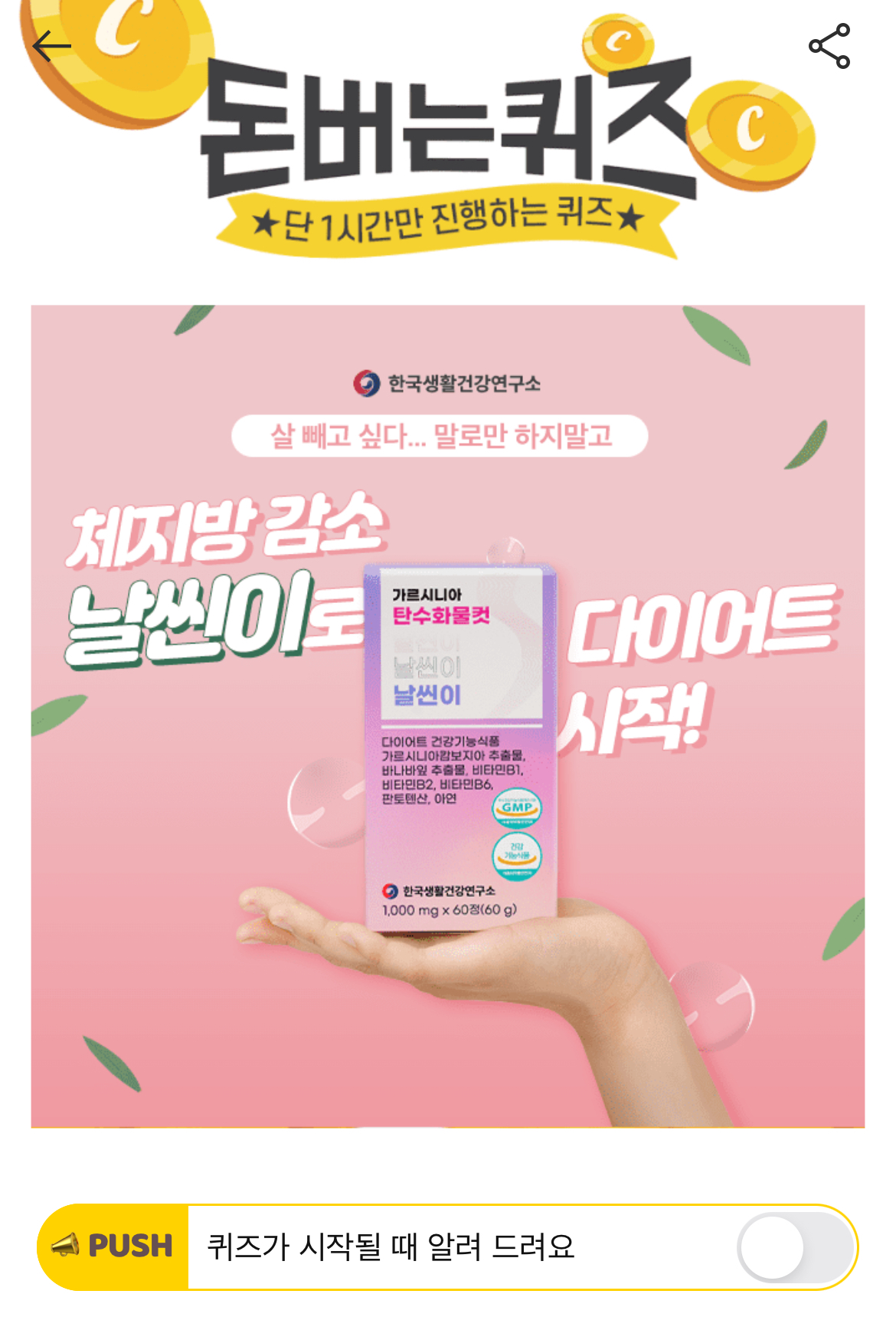 캐시워크 돈버는퀴즈 정답 한국생활건강연구소 가르시니아 탄수화물컷 날씬이 OO주간