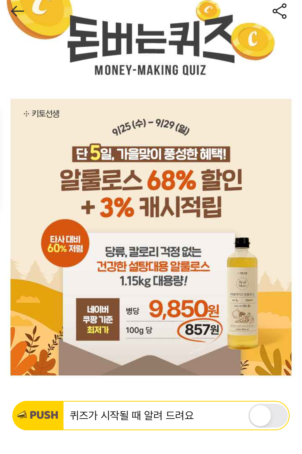 단 5일] 가을맞이 풍성한 혜택! 리얼마이즈 알룰로스 68% 할인! 1.15kg 대용량 알룰로스 단돈 9,850원 & 네이버, 쿠팡 기준 최저가 100g당 857원! 우리가 먹는 요리마다 많은 설탕이 들어가는 사실을 아시나요? 이제 리얼마이즈 알룰로스로 당, OOO OO는 줄이고 건강한 식탁을 만들어보세요! OOOOO은 무엇일까요?