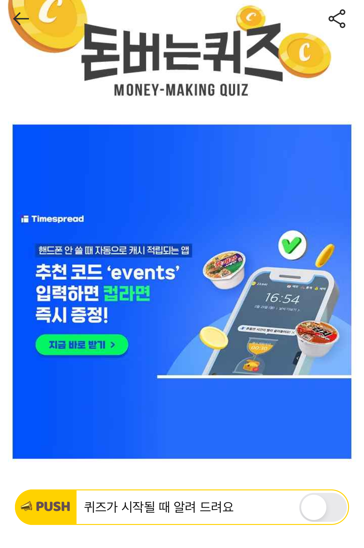 앱 최초 설치 시, 캐시 지급되는 타임스프레드는 핸드폰 O O OO만큼 캐시를 적립해주는 방치형 리워드 앱입니다. 추천 코드 입력하고 컵라면도 받아가세요! O O OO에 들어갈 단어를 찾아주세요.