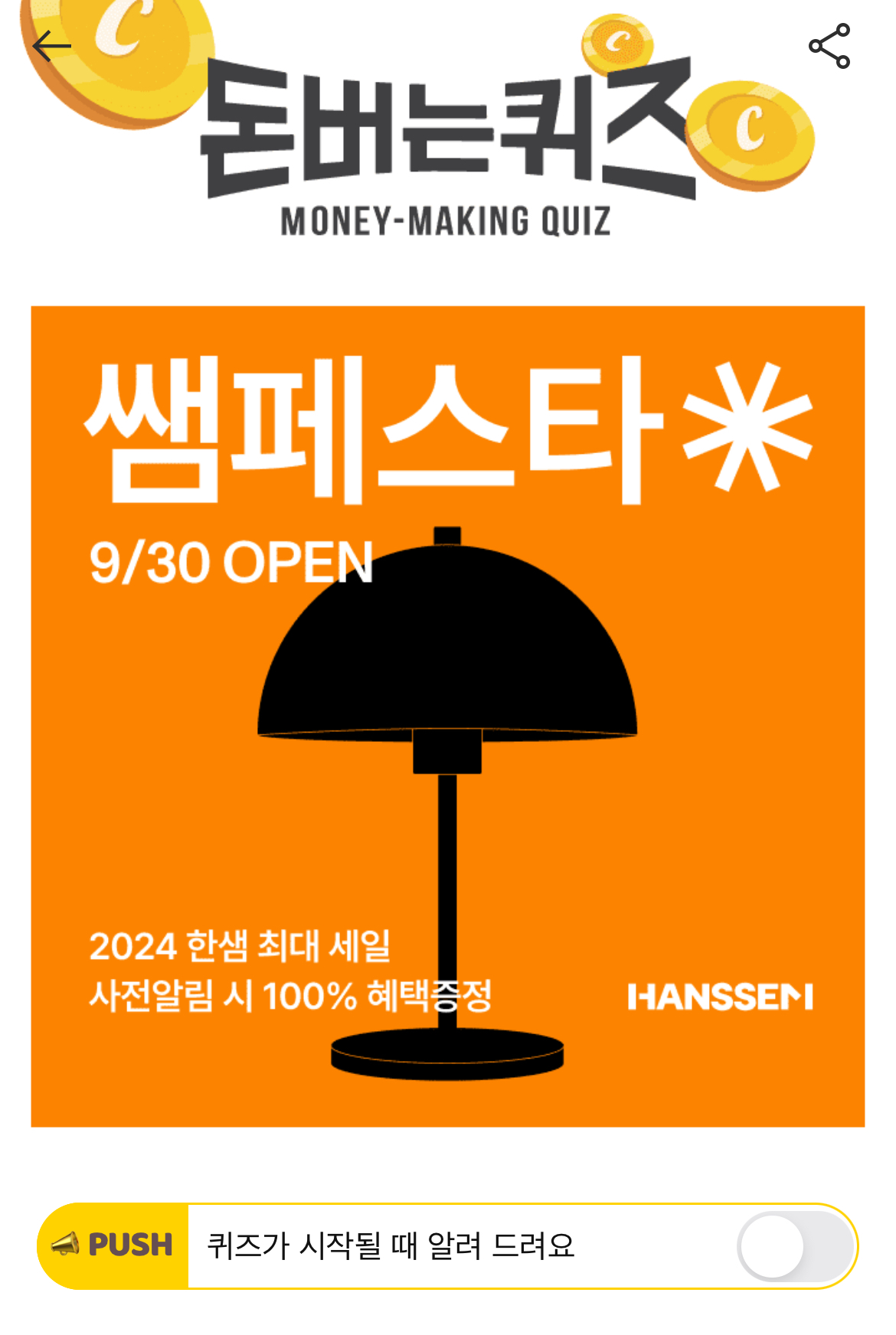 캐시워크 돈버는퀴즈 정답 2024 한샘 최대 세일 이벤트 쌤페스타 포인트 O천점