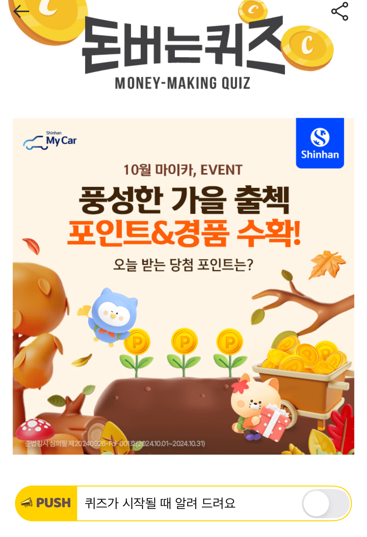 캐시워크 돈버는퀴즈 정답 신한마이카 노리터 출석체크 이벤트 ㄱㄱㅂㅍㅇㅌ / ㅁㅊㅅㅇ