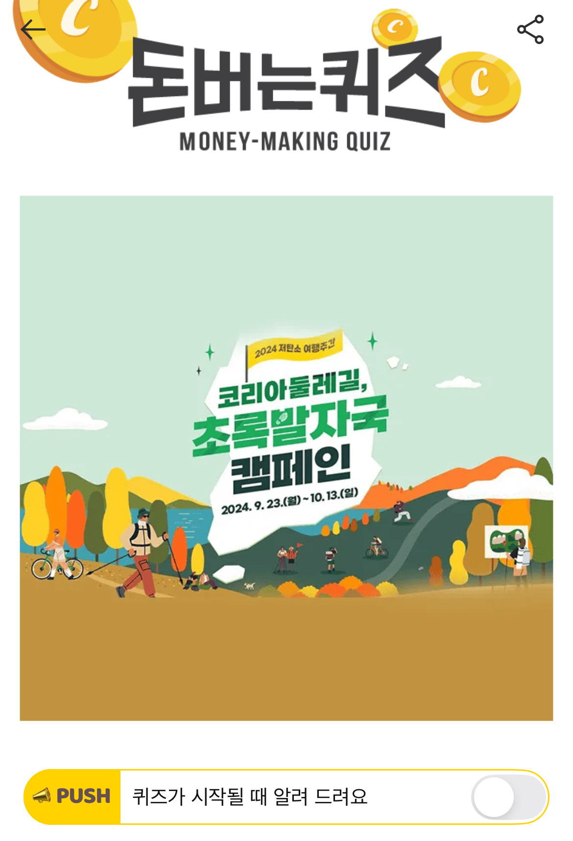 두루누비(코리아 둘레길) 앱 다운 받고, 초록발자국 캠페인 참여해보세요! 초록발자국 캠페인은 걷기, 자전거, 캠핑 등 OOOOO을 줄이는 여행 방법으로 저탄소 여행주간(9/23~10/13)을 실천하고, 함께 지구를 지키는 캠페인입니다. OOOOO에 들어갈 단어를 찾아주세요.