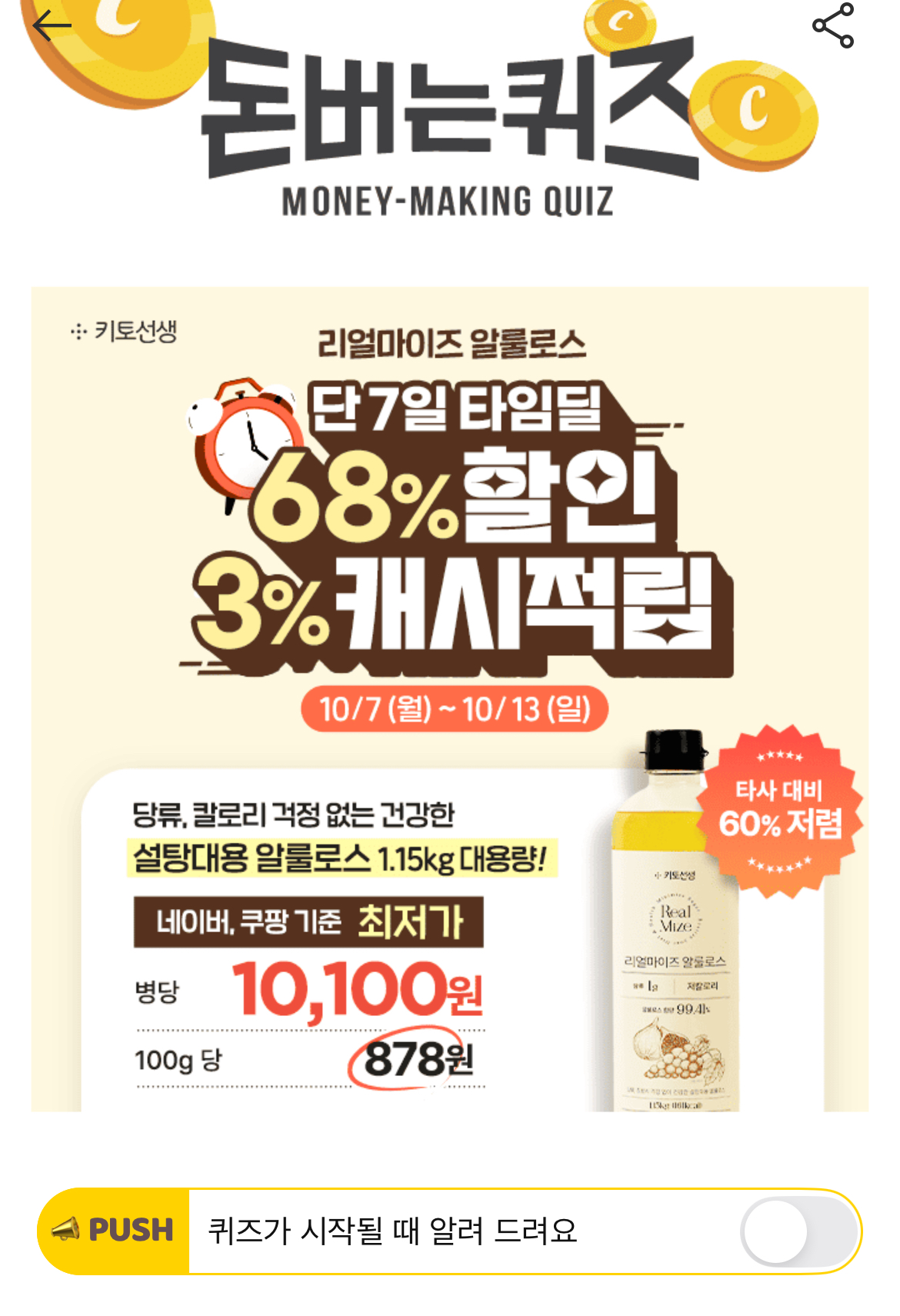 타임딜] 단 7일간 알룰로스 68% 할인 & 1.15kg 대용량 병당 10,100원 (+ 3% 캐시적립) 네이버, 쿠팡 기준 최저가 혜택, 100g당 878원! 당류와 칼로리 가득한 설탕은 그만! 리얼마이즈 알룰로스는 일상 속에서 당류, 칼로리 부담 없이 달콤함을 즐길 수 있는 OO OOO를 찾으시는 분께 추천드려요! OOOOO는 무엇일까요?
