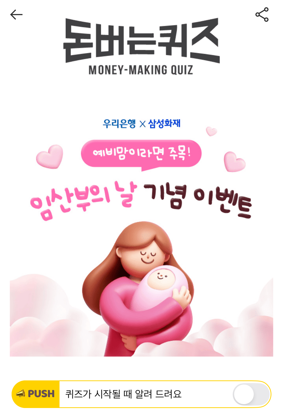 [예비맘이라면 구경하고 가세요!] 우리은행 계좌를 인증하면 임산부를 위한 우리함께 엄마준비 안심보장보험 보험료가 OO! 여기서 OO는 무엇일까요? (초성힌트: ㅁㄹ)