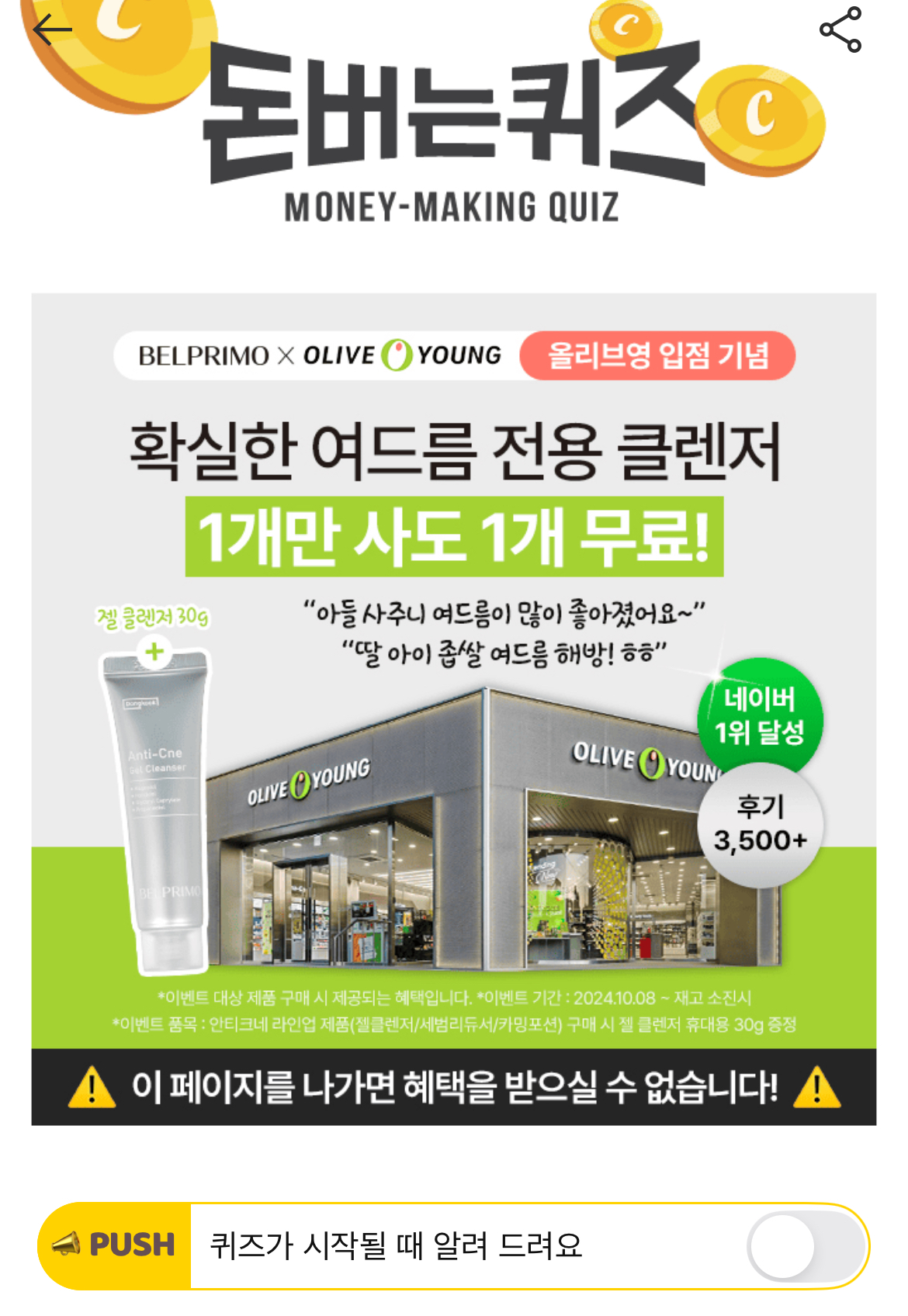 캐시워크 돈버는퀴즈 정답 올리브영 벨프리모 안티크네 젤 클렌저