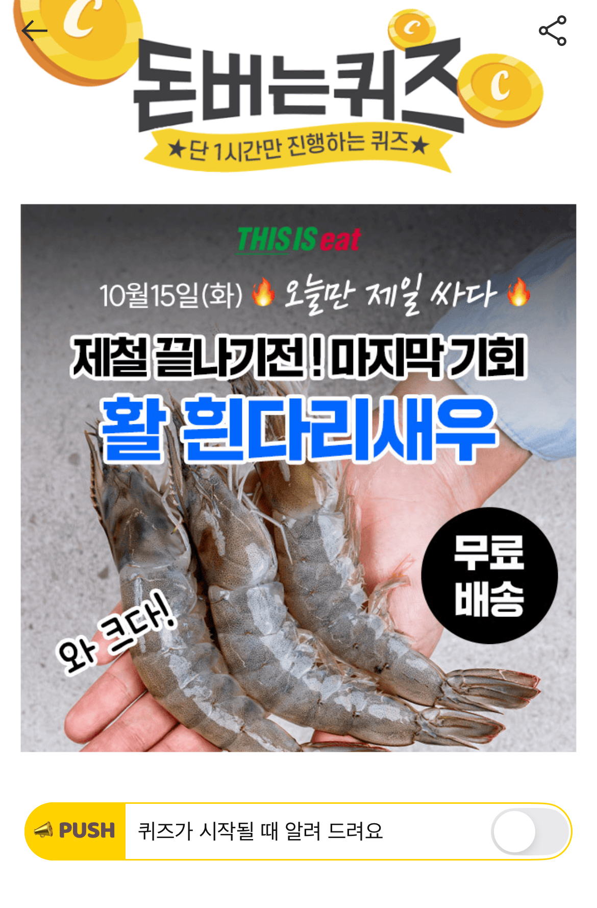 캐시워크 돈버는퀴즈 정답 캐시딜 타임특가 디스이즈잇 전남 신안 프리미엄 활 흰다리새우 1kg