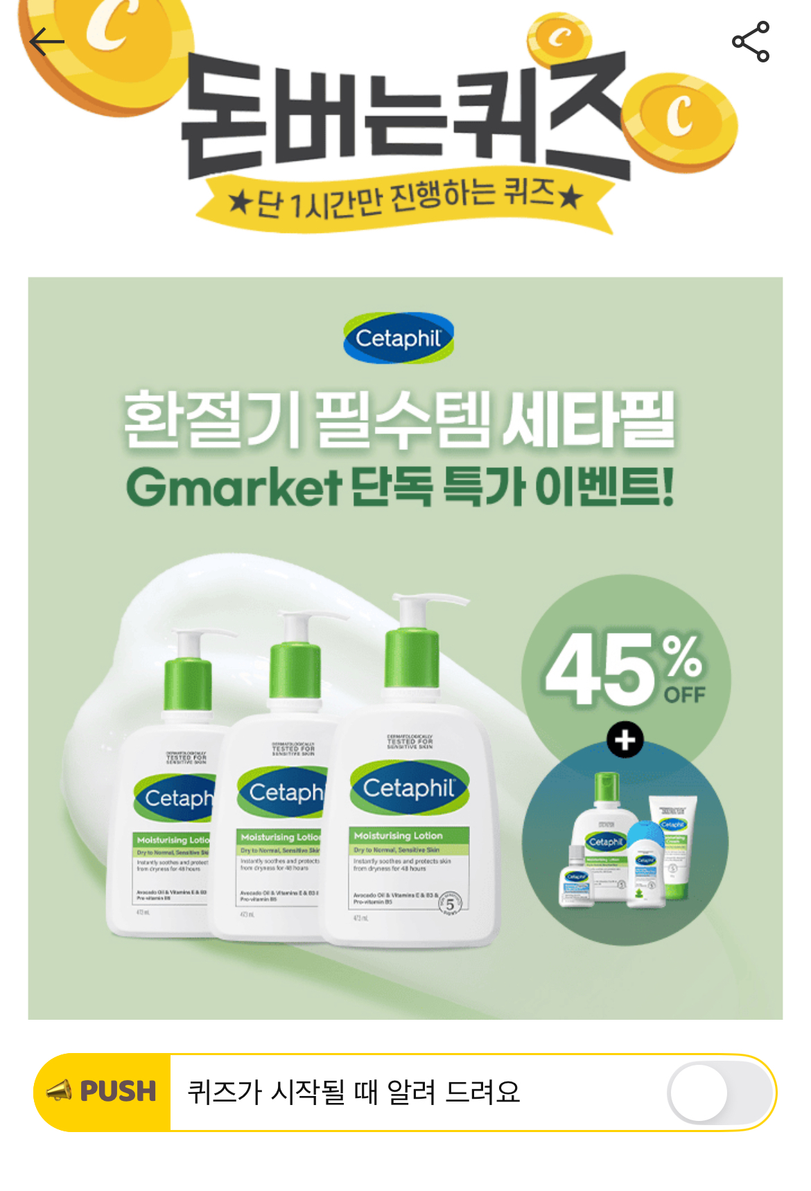 | 오늘 10월 21일 캐시워크 돈버는퀴즈 정답 캐시딜 타임특가 라벨영 버블 쇼킹폼클렌징 (0) | 2024.10.21 |