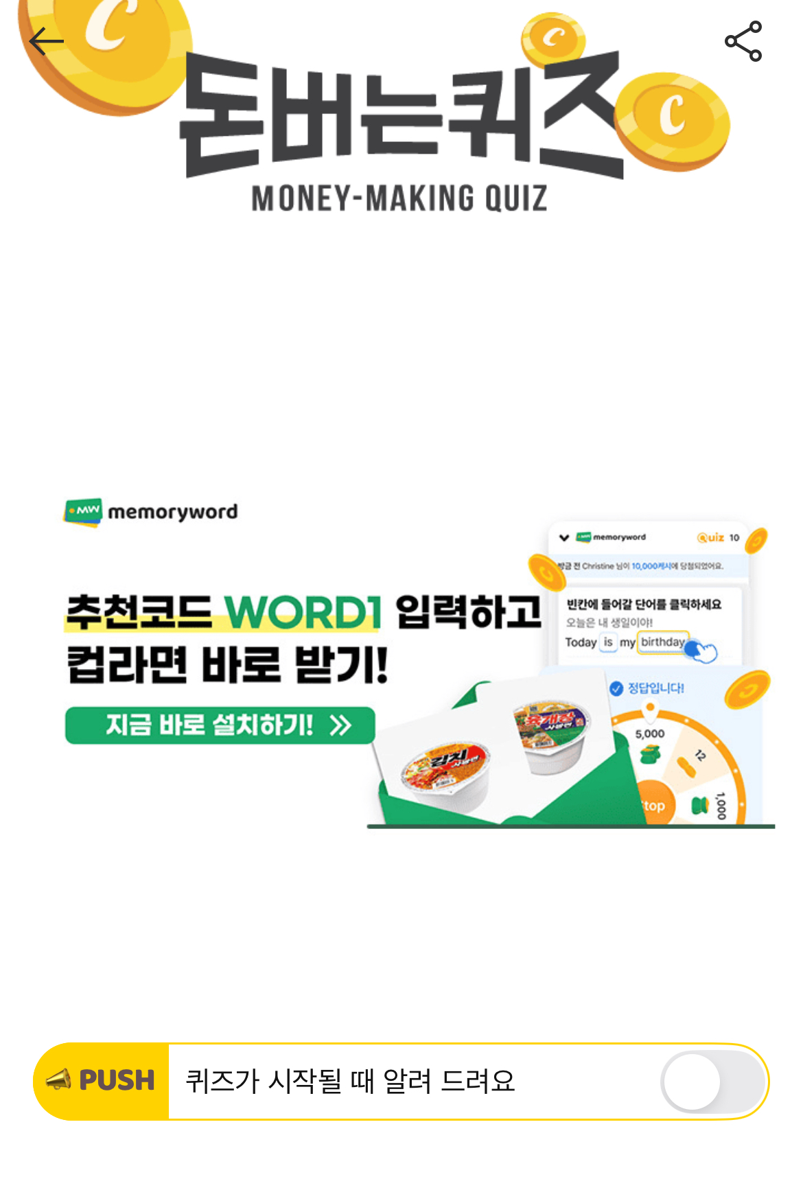 OOOO 1문제만 풀어도 돈 주는 앱, 메모리워드에서 앱 설치 시, 추천인 코드 기입하여 가입하면 컵라면을 증정하는 이벤트를 진행 중입니다. OOOO에 들어갈 단어를 찾아주세요.