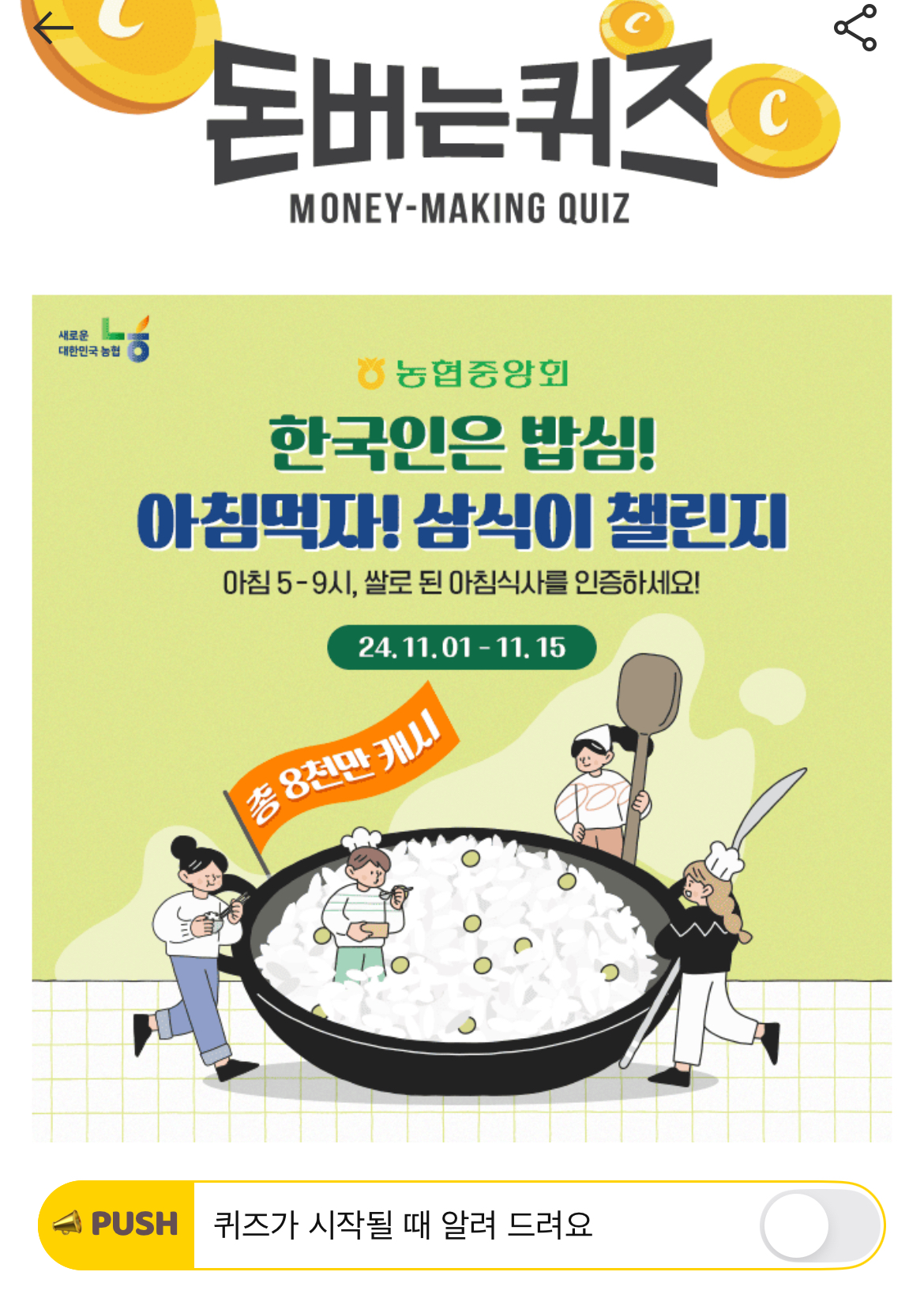 캐시워크 돈버는퀴즈 정답 농협중앙회 아침먹자! OOO 챌린지