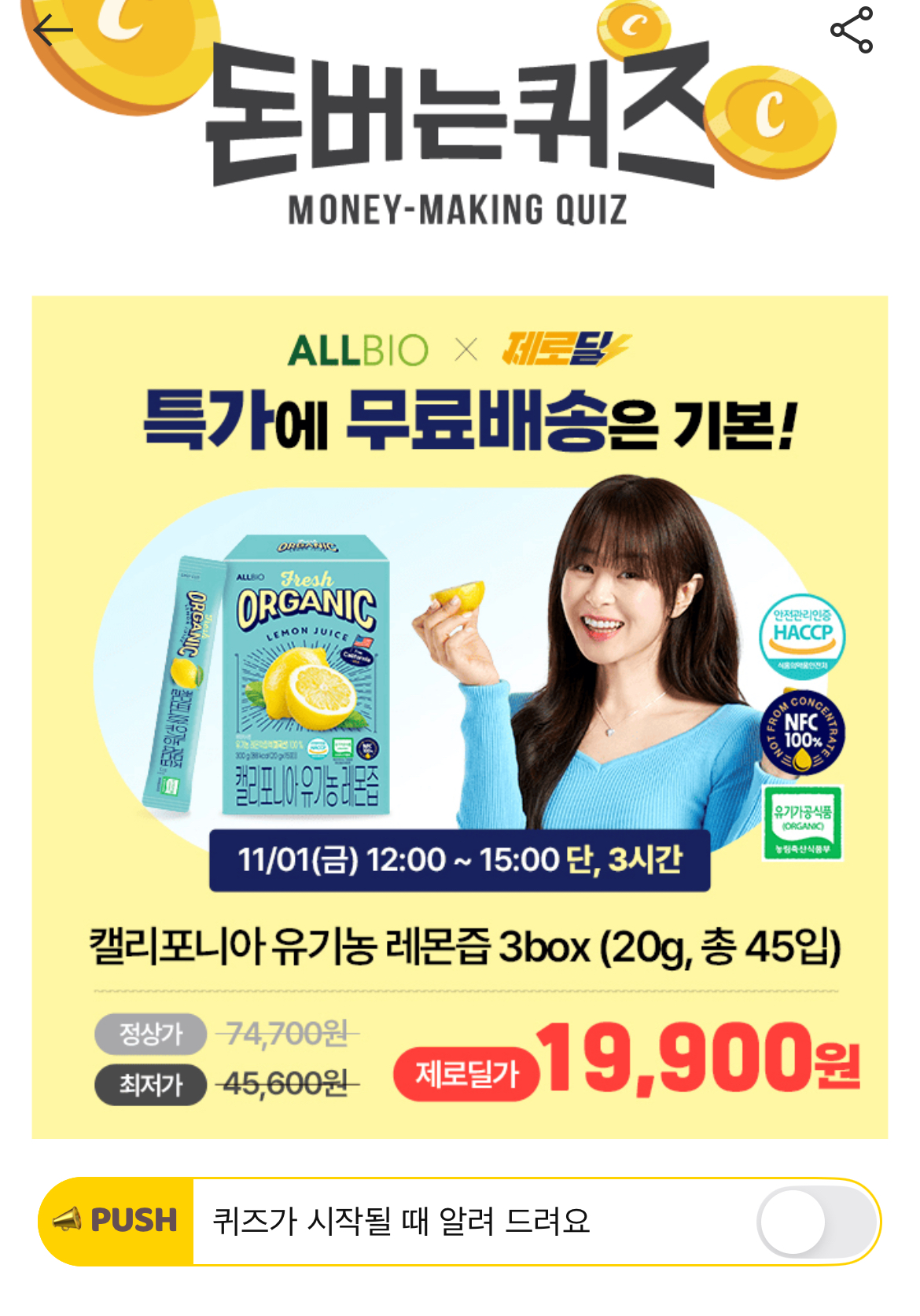 캐시워크 돈버는퀴즈 정답 캐시딜 올바이오 레몬즙 스틱 3박스