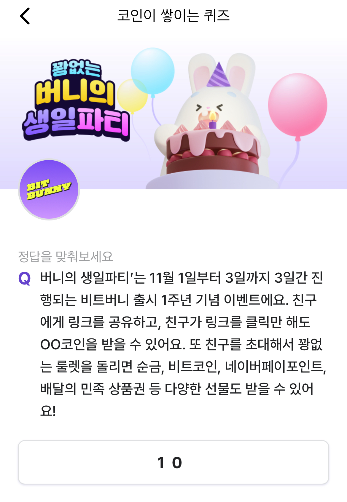 비트버니 코인이 쌓이는퀴즈 정답 버니의 생일파티