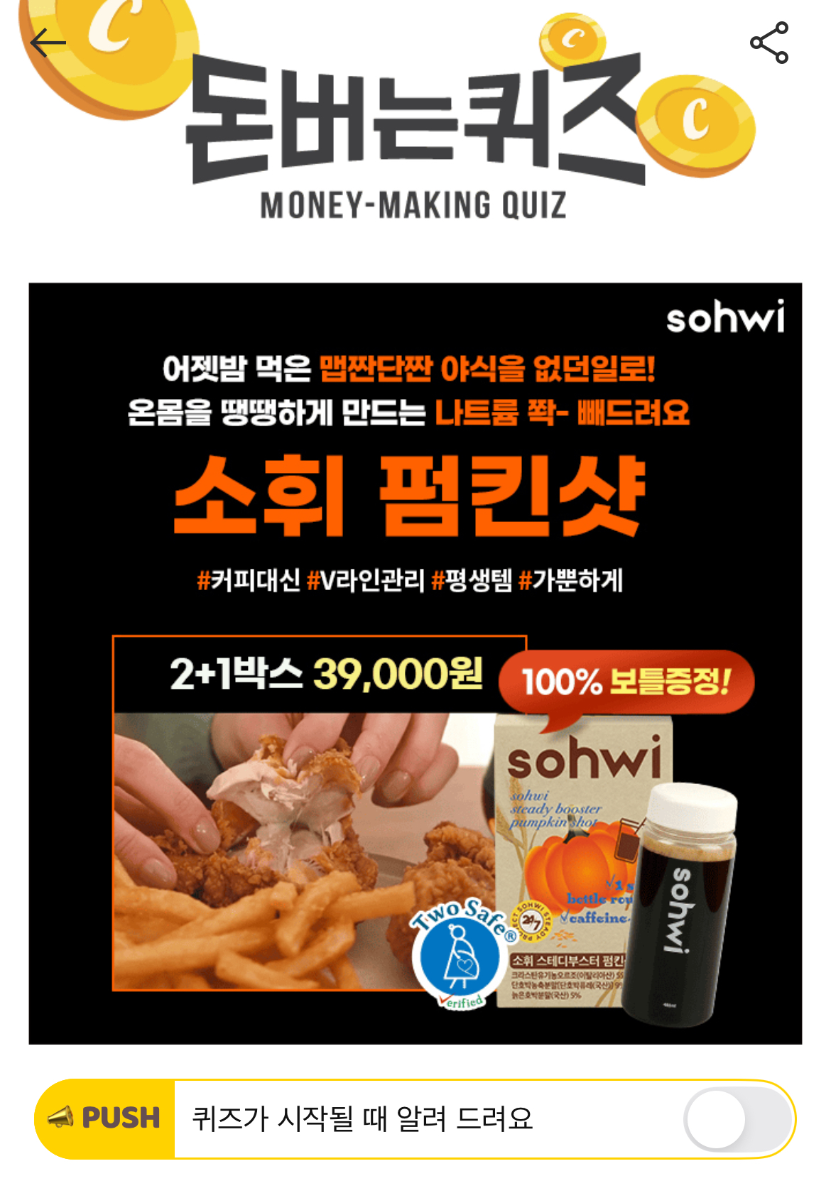 어제 또 잔뜩 먹고 잤나요? 걱정마세요 나트륨 쫙 빼드릴게요 죄책감대신 날렵한 아침을 경험하세요! 11월 마지막 혜택 어제먹은 맵짠식단 걱정 끝내드릴게요! V라인 관리를 위한 소휘 펌킨샷은 하루1포 단 11칼로리로 숨어있는 V라인을 찾아드려요. 나트륨, 수분은 빼내고 풍부한 OOOO는 보충해 드려요. 커피대신 날씬하게 즐기세요. 여기서 OOOO는?